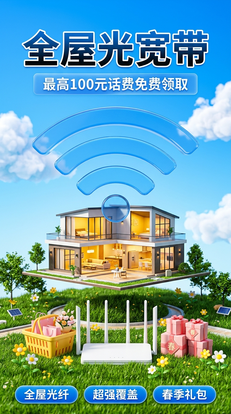 "主标题": "顶部加粗蓝色渐变黑体“全屋光宽带”,带有白色描边增强识别度。",