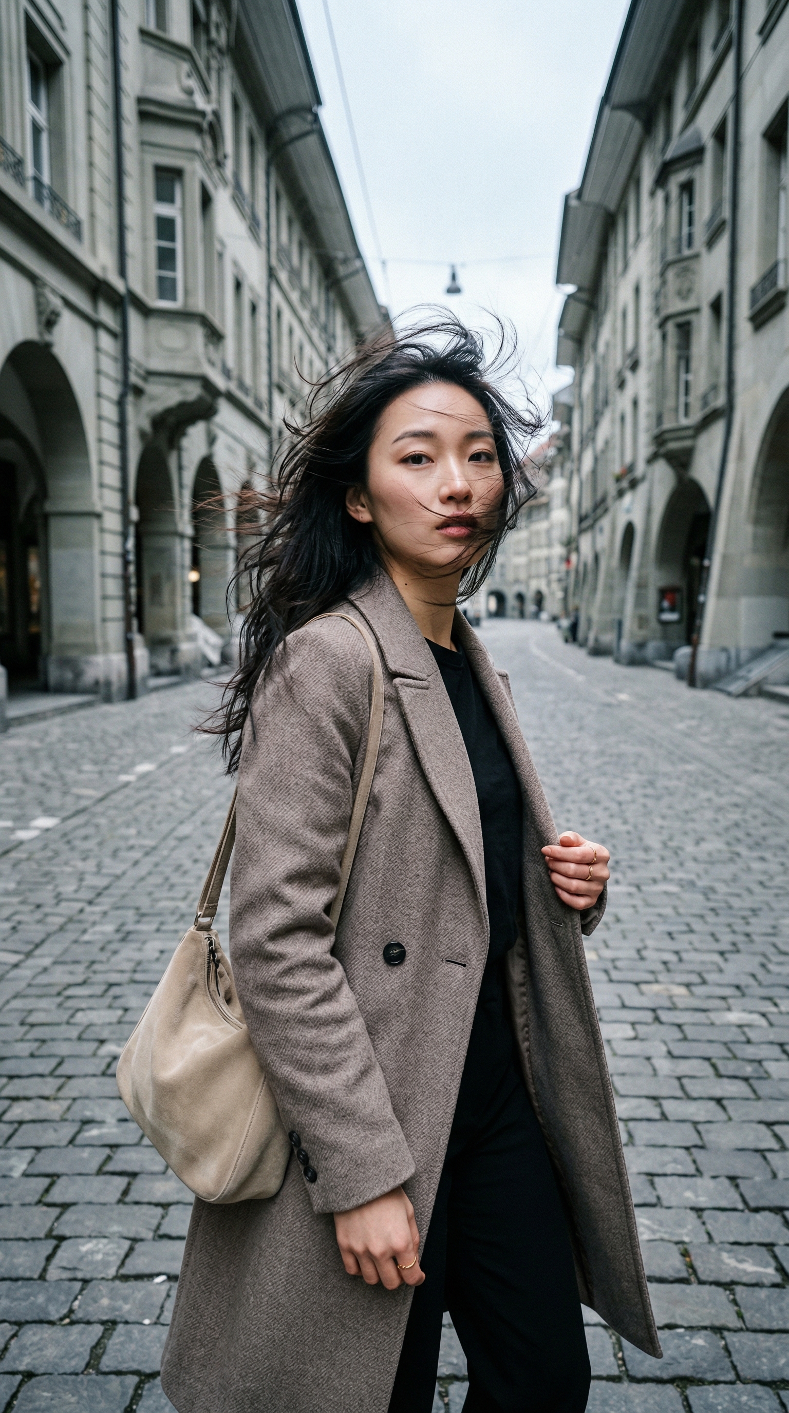 东亚女性的时尚诠释: 特别设定为东亚少女,打破了欧美街拍的常规,将东亚面孔融入古典欧洲背景。通过“灰褐色风衣”、“米色麂皮包”和“金色戒指”等细节,塑造了一个现代、时尚且具个性的东亚女性形象。