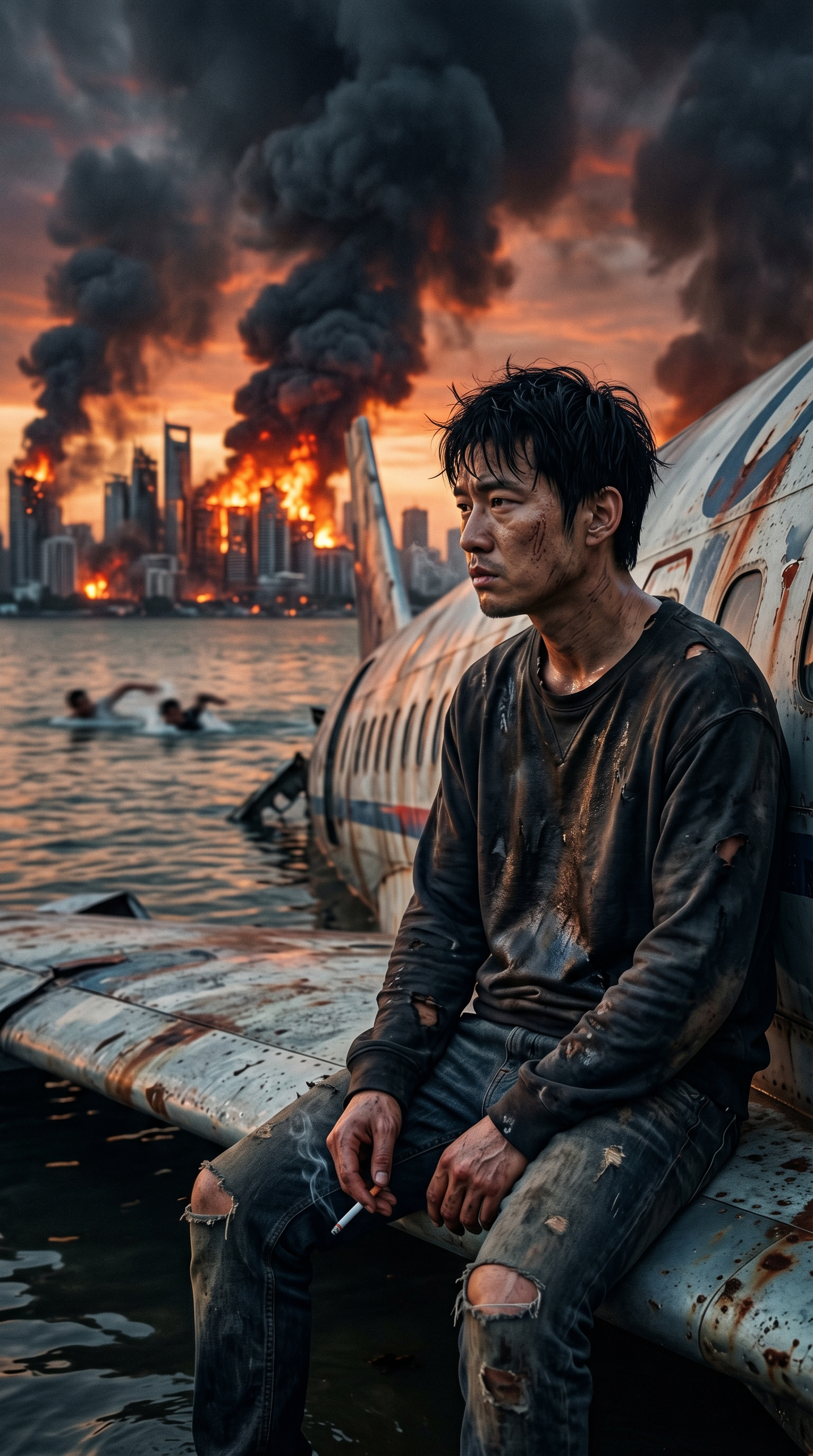 本提示词旨在创作一张极具电影感和叙事性的写实照片。画面核心是一名刚经历灾难的东亚男性,他满身泥泞,衣衫褴褛,正靠在一架半潜水中的坠毁飞机机翼上稍作喘息。他指间夹着香烟,凝视着远方被战火和浓烟吞没的末日城市。画面背景是壮丽而凄惨的夕阳,水中还有模糊的身影在挣扎求生。整个场景充满了绝望、孤独以及在灾难面前的冷静,细节丰富,质感逼真。