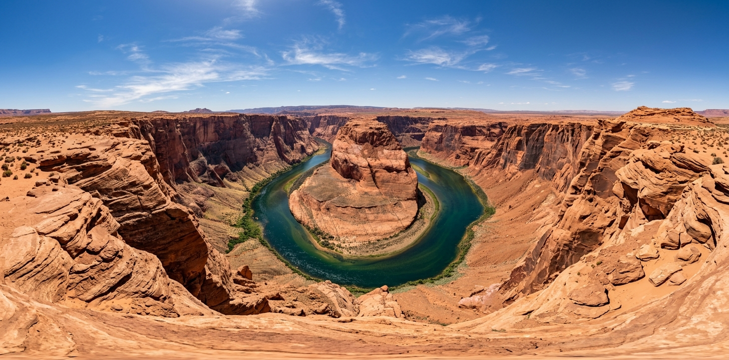 提示词简介:本提示词旨在完美复刻科罗拉多河在马蹄湾形成的 270 度巨大 U 型转弯。重点在于捕捉深绿色河水与赤红色纳瓦霍砂岩之间的强烈色彩对比,以及在 360 度全景视角下,断崖边缘向中心汇聚的惊人透视感。画面需呈现出一种极度干燥的荒漠空气感,结合午后强烈的直射光,使岩石的每一层沉积纹理都清晰可见。