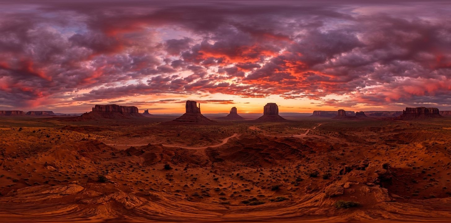 提示词简介:捕捉美国西部最具代表性的纪念碑谷在日落时分的壮丽时刻。重点在于渲染天空极具戏剧性的色彩变化——从深紫色到火红色,并利用这种背光或侧光环境,勾勒出地质孤峰嶙峋的轮廓。360 度全景需让观者感受到身处荒漠中心的孤独感与宇宙般宏大的地质史诗感。