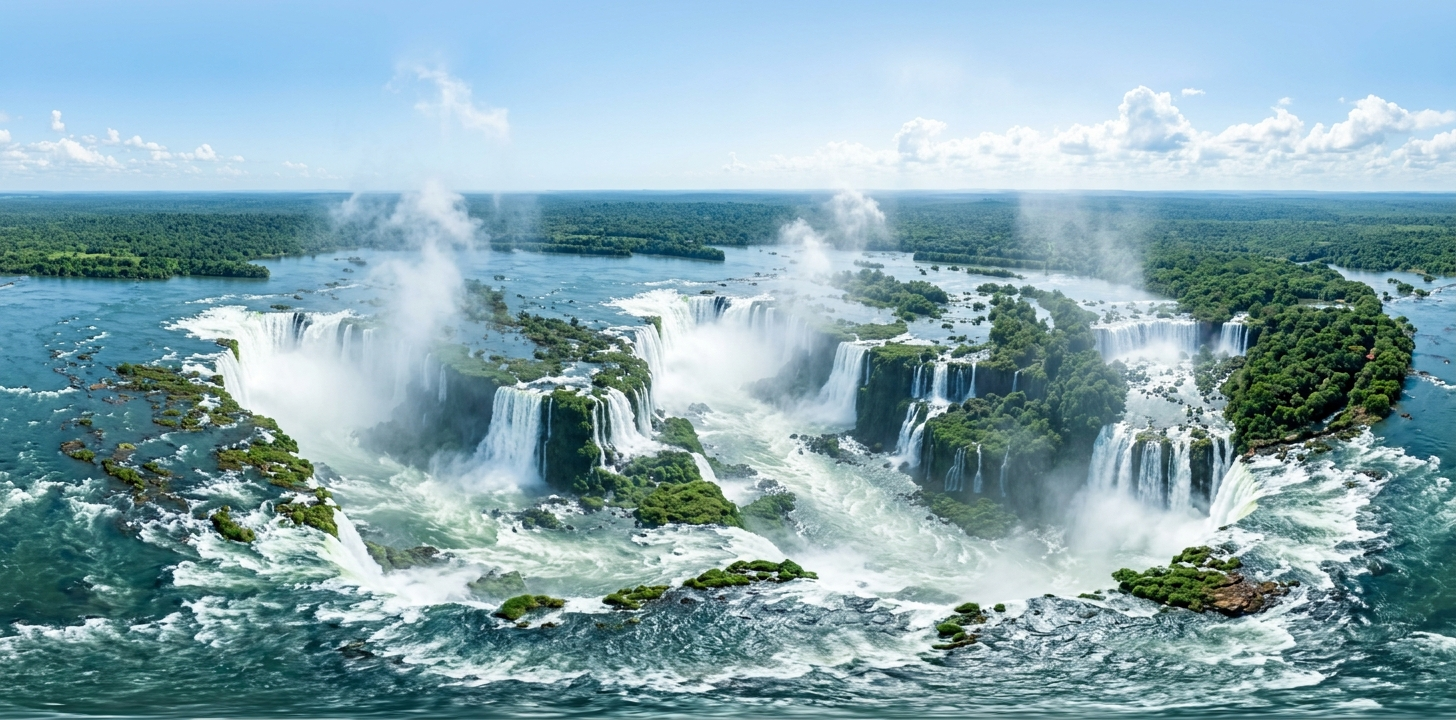 提示词简介:复刻世界三大瀑布之一伊瓜苏瀑布的 360 度环绕景观。核心在于展现“众水汇聚”的动态张力,将白色的急流、绿色的热带岛屿与升腾的半透明水雾有机结合。全景视角需要带给观者一种被咆哮的巨量瀑布包围的沉浸式体验,色彩清透且富有湿润感。