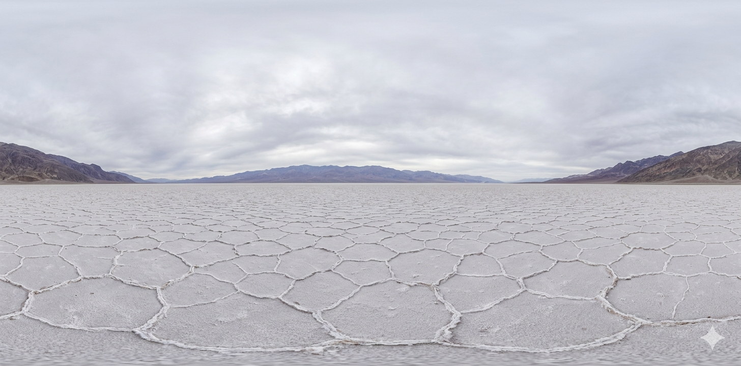 提示词简介:聚焦于美国死谷国家公园最独特的盐碱地貌。提示词重点在于描绘地面干涸后形成的自然六角形盐壳纹路,这种纹路在 360 度全景中能产生极强的视觉引导力和节奏感。色调倾向于极简的白、灰与远山的淡紫,呈现一种极度的荒凉美。