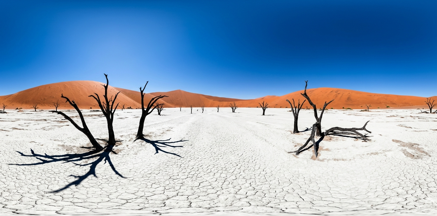 提示词简介:捕捉纳米比亚纳米布沙漠中“死亡谷”最震撼的一面。提示词核心在于构建极简主义的四重视觉冲突:深蓝的天空、橙红的沙丘、洁白的盐盆以及炭黑色的千年枯树。通过 360 度视角,将观者置于这幅自然界亲手绘制的超现实主义油画之中。