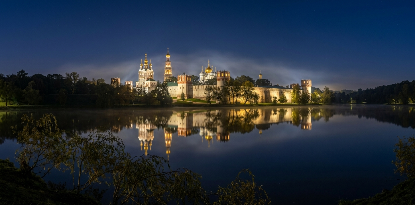 提示词简介:表现莫斯科著名的东正教建筑群在静谧夜晚的古典之美。提示词核心在于利用水面形成的 360 度完美倒影,营造出一种超凡脱俗、宁静致远的俄罗斯宗教氛围。重点在于处理金色穹顶在夜色中的点光源效果,以及薄雾赋予画面的柔焦质感。