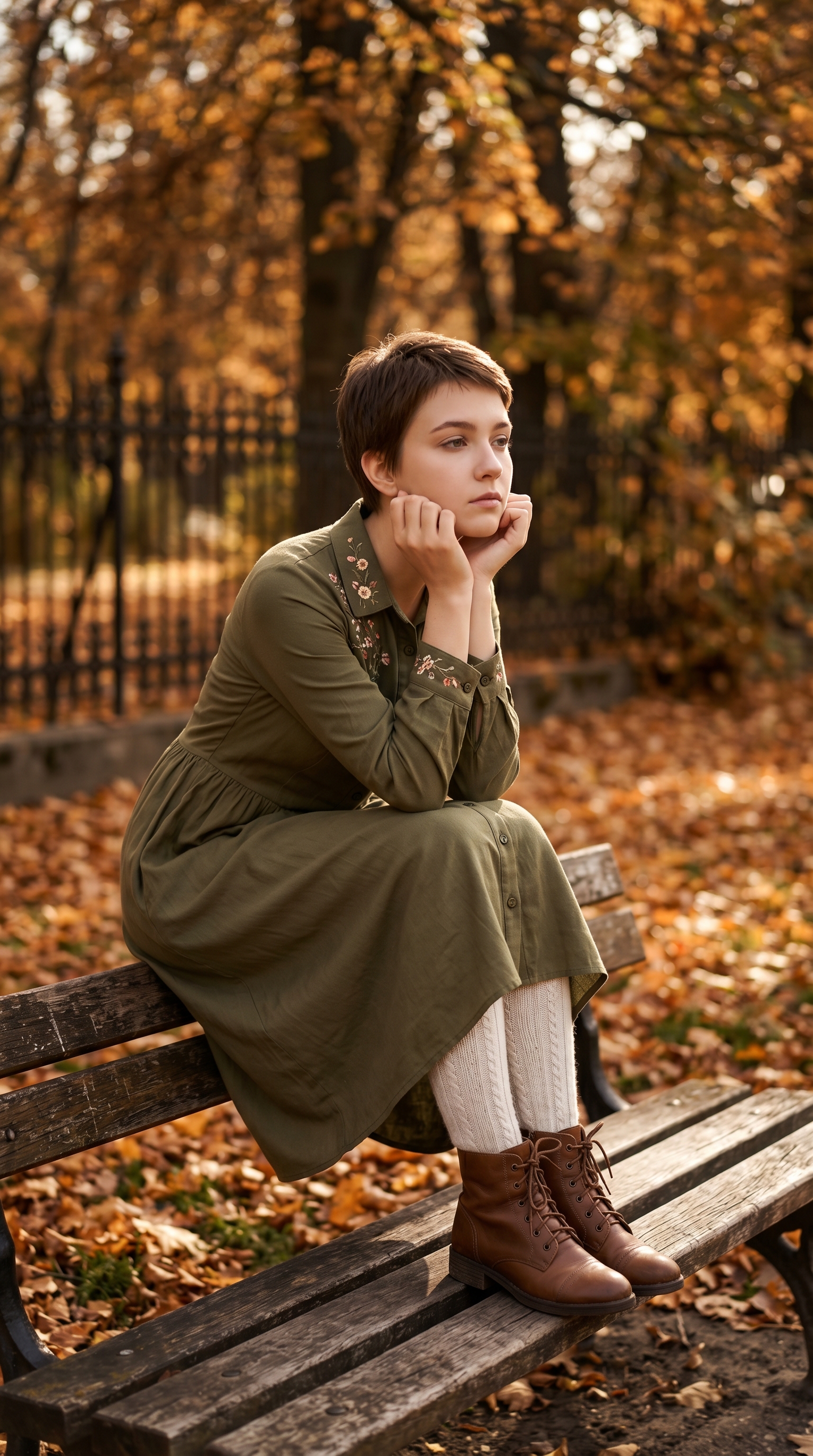 这组提示词旨在构建一个叙事感极强的深秋人像场景。它不仅精确捕捉了服装的材质(如针织与皮革)和色彩搭配(橄榄绿与金橙的撞色),更通过环境描写烘托出一种“时间静止”的静谧氛围。通过长焦大光圈的模拟手法,让主体从复杂的秋日背景中脱颖而出。