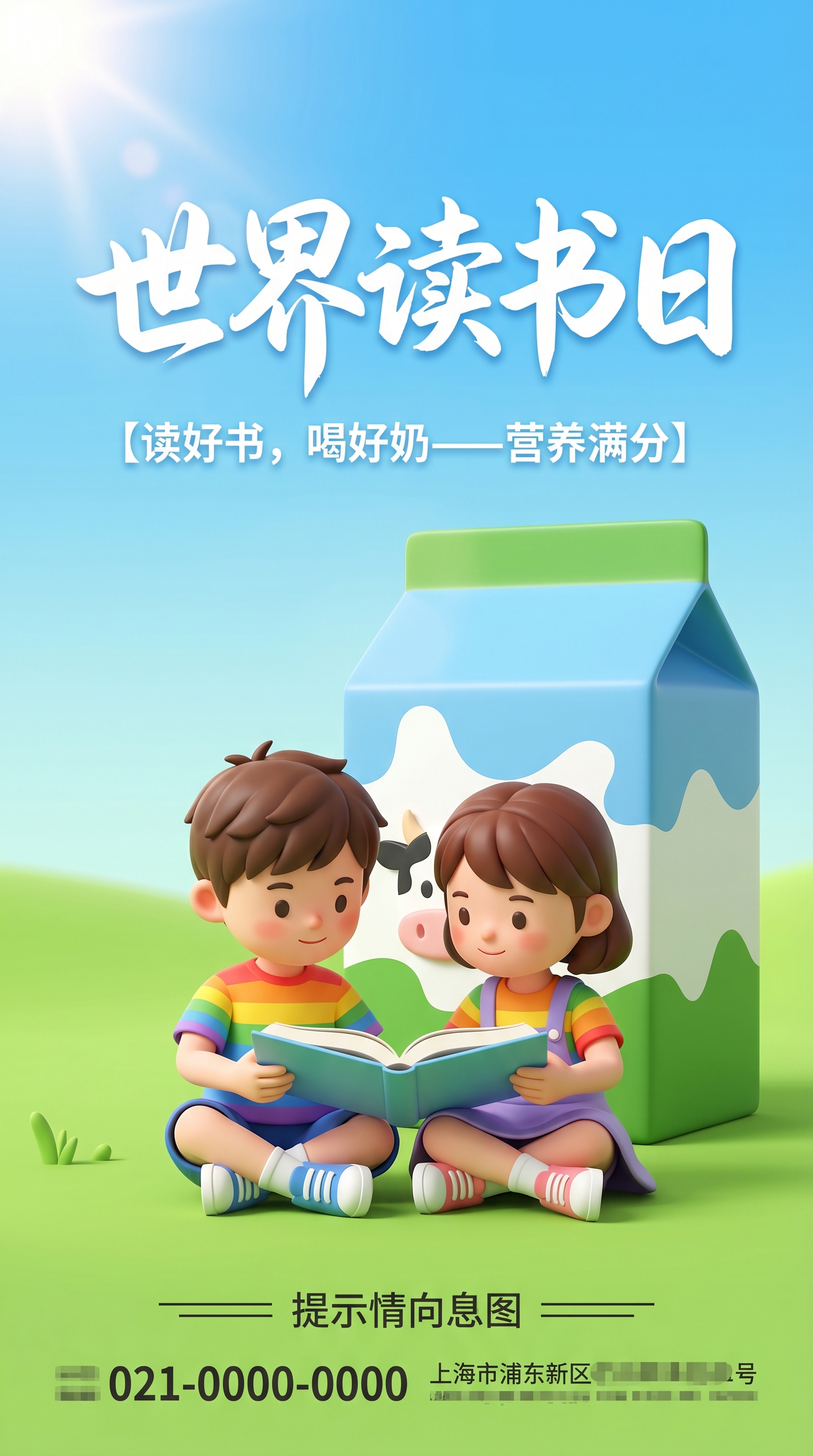 提示词简介: 本提示词用于生成一张极具亲和力的3D卡通黏土风格(Claymation/3D Cartoon style)跨界营销海报。画面的核心概念是将“营养摄入”与“知识汲取”巧妙结合。整体采用高明度的天空蓝与草地绿作为环境主色。布局采用居中对称式结构。文字信息被精简并置于画面的最上方,包括充满活力的纯白手写书法体主标题“世界读书日”,以及强调主题关联的副标题。视觉中心(Y:60%)由三个核心3D模型构成:背景是一个巨大的、印有黑白奶牛笑脸图案的纸质牛奶盒;前景是一对采用3D卡通渲染(皮克斯风格)的可爱小男孩和小女孩,他们并肩坐在翠绿的草地上专注地阅读一本摊开的彩色书籍。提示词严格控制了画面的光影,要求使用明朗的全局光照(Global Illumination)和柔和的漫反射,坚决杜绝任何阴森或压暗的死黑阴影。对于所有文字内容,明确指令强制AI仅生成中文字符。