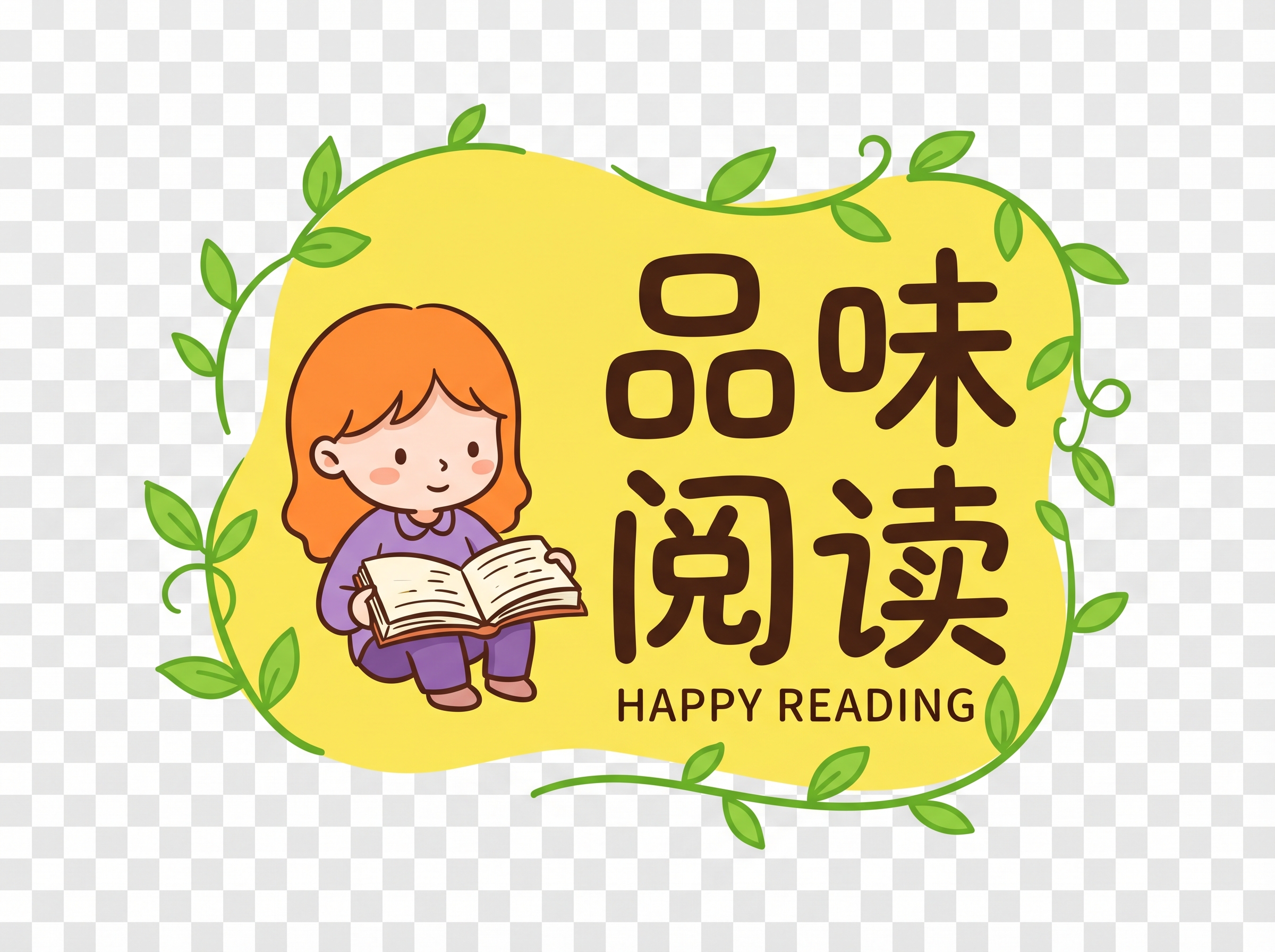 { "元素": "看书女孩", "位置": "左侧", "风格": "Q版简约插画", "颜色": "橙色头发/紫色衣服" },
