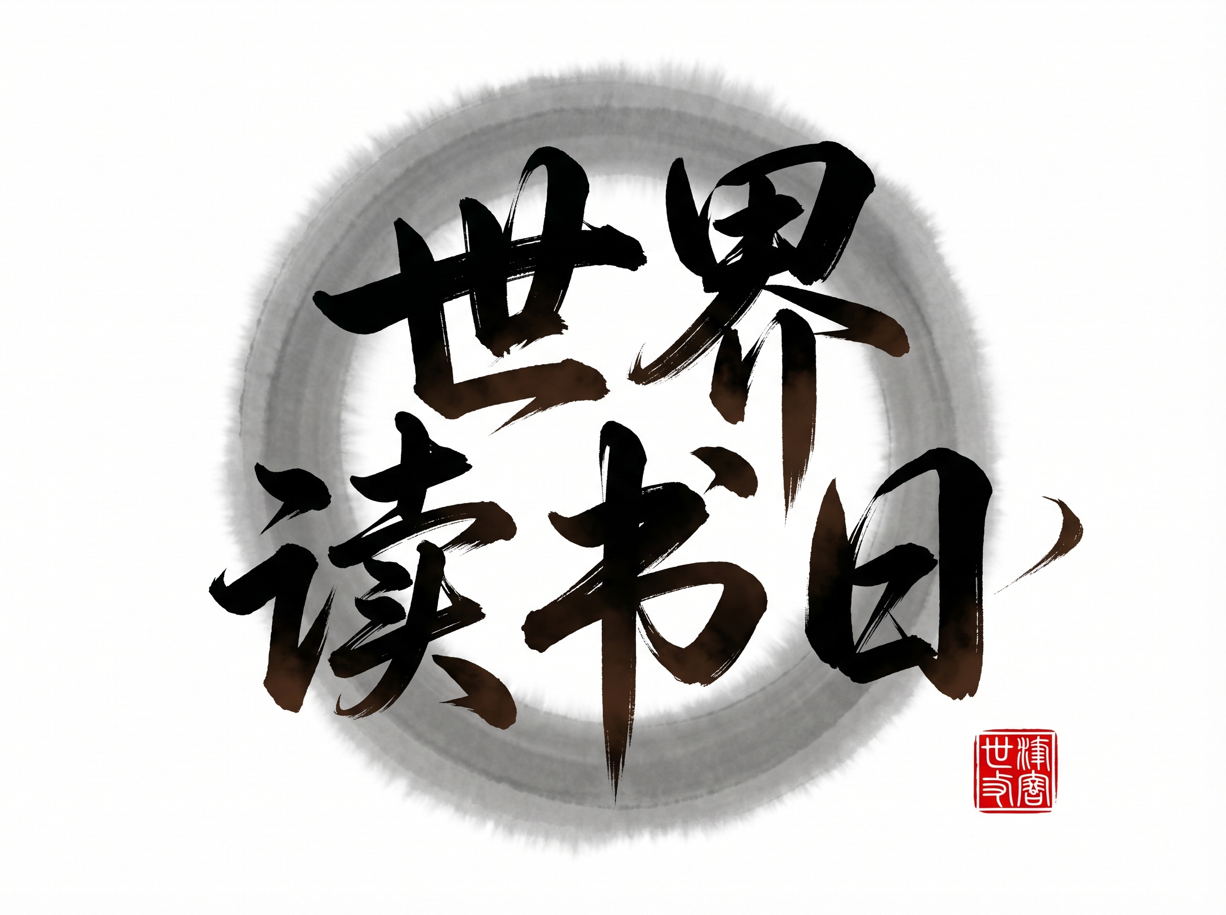 本设计强调“中国韵味”,采用传统书法与现代水墨背景结合的形式。主标题“世界读书日”以苍劲有力的行草书体呈现,笔触间带有明显的枯笔与飞白效果。背景为一个大面积的灰色水墨圆环,中心印有红色的篆刻印章,展现出深厚的文化底蕴。
