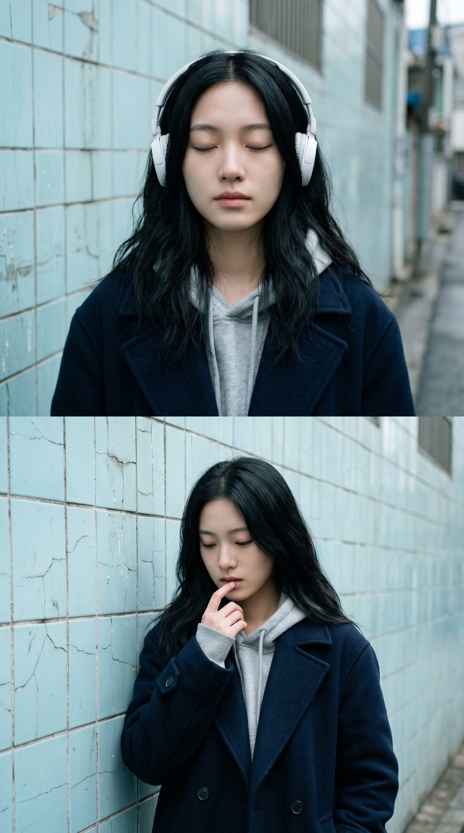 "内容描述": "这是一张电影质感的双格胶片摄影。画面表现一位留着黑色波浪长发的年轻女性,身穿深蓝色羊毛大衣内搭灰色连帽衫。她在城市小巷的一面斑驳的浅青色瓷砖墙边,展现出静谧与沉思的两种状态。",