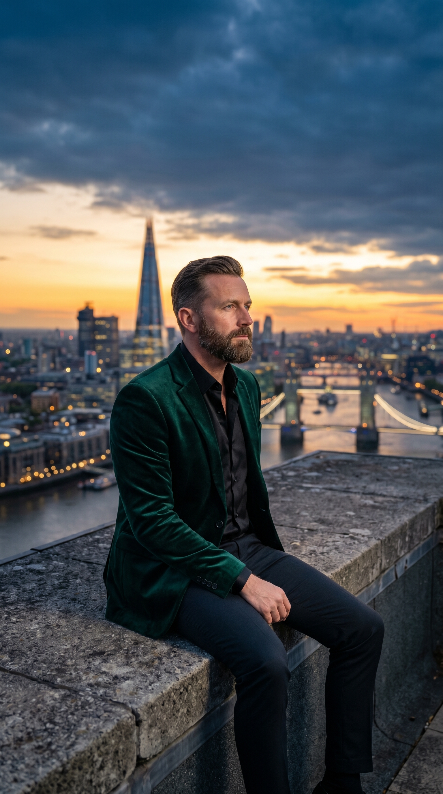 "内容描述": "一位穿着考究、蓄着精致胡须的男士坐在混凝土屋顶边缘,身穿深墨绿色丝绒西装外套,内搭黑色衬衫与修身长裤,神情深邃地眺望远方。背景是落日余晖下的伦敦全景,包括碎片大厦(The Shard)和塔桥(Tower Bridge)。",