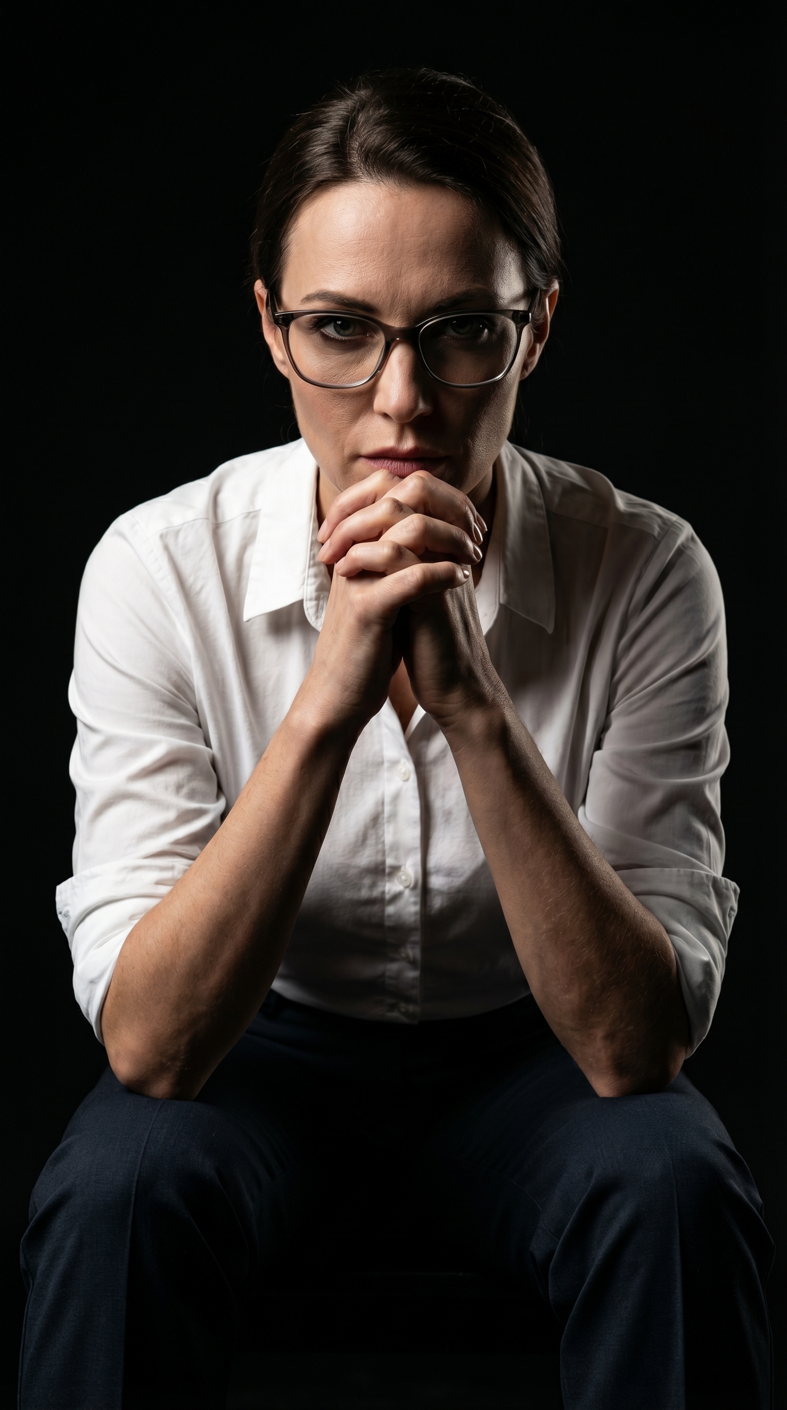本提示词旨在生成一张高规格的时尚社论人像,风格模仿《GQ》杂志。画面主角是一位佩戴眼镜的女性精英,她端坐在纯黑背景的摄影棚中,身体前倾,双手交握于面部前方,展现出一种极具压迫感但又迷人至极的姿态。她的表情严肃中透着诱惑,通过强烈的戏剧化光影和电影级的画质,营造出一种高级、神秘且自信的氛围。