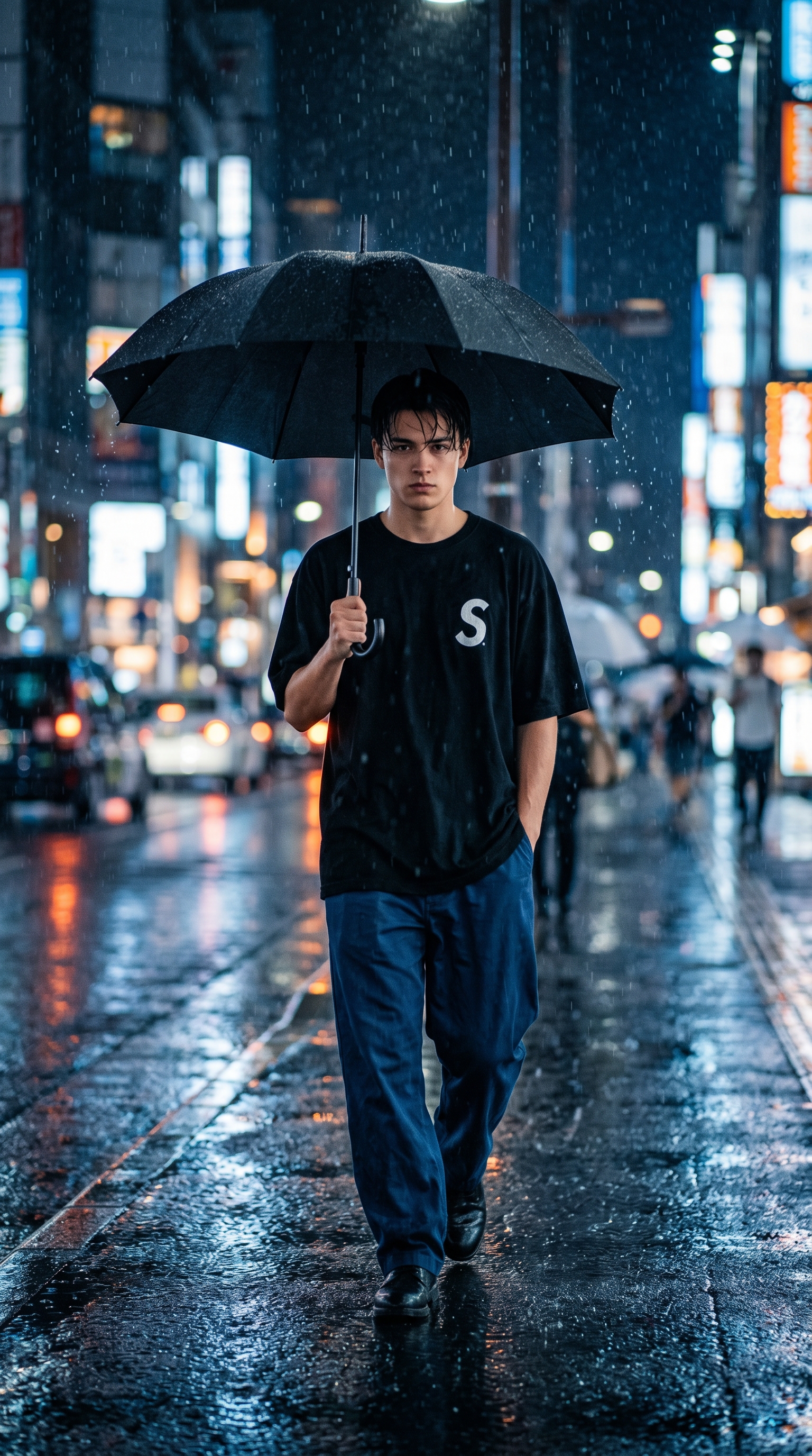 这幅画面描绘了一个充满故事感的瞬间。在倾盆大雨的都市街头,一位年轻男子手持黑色雨伞迎面走来。他神情冷峻,目光坚定地注视着镜头。画面捕捉了他放松而自然的行进步态,身着宽松的黑色T恤和蓝色长裤,尽显都市潮流风格。雨水淋湿了街道,霓虹灯光在积水中交织出迷幻的反光。超写实的电影质感、深邃的蓝调氛围、以及细腻的雨珠与光影细节,共同营造出一种孤独、冷冽却又充满张力的视觉体验。