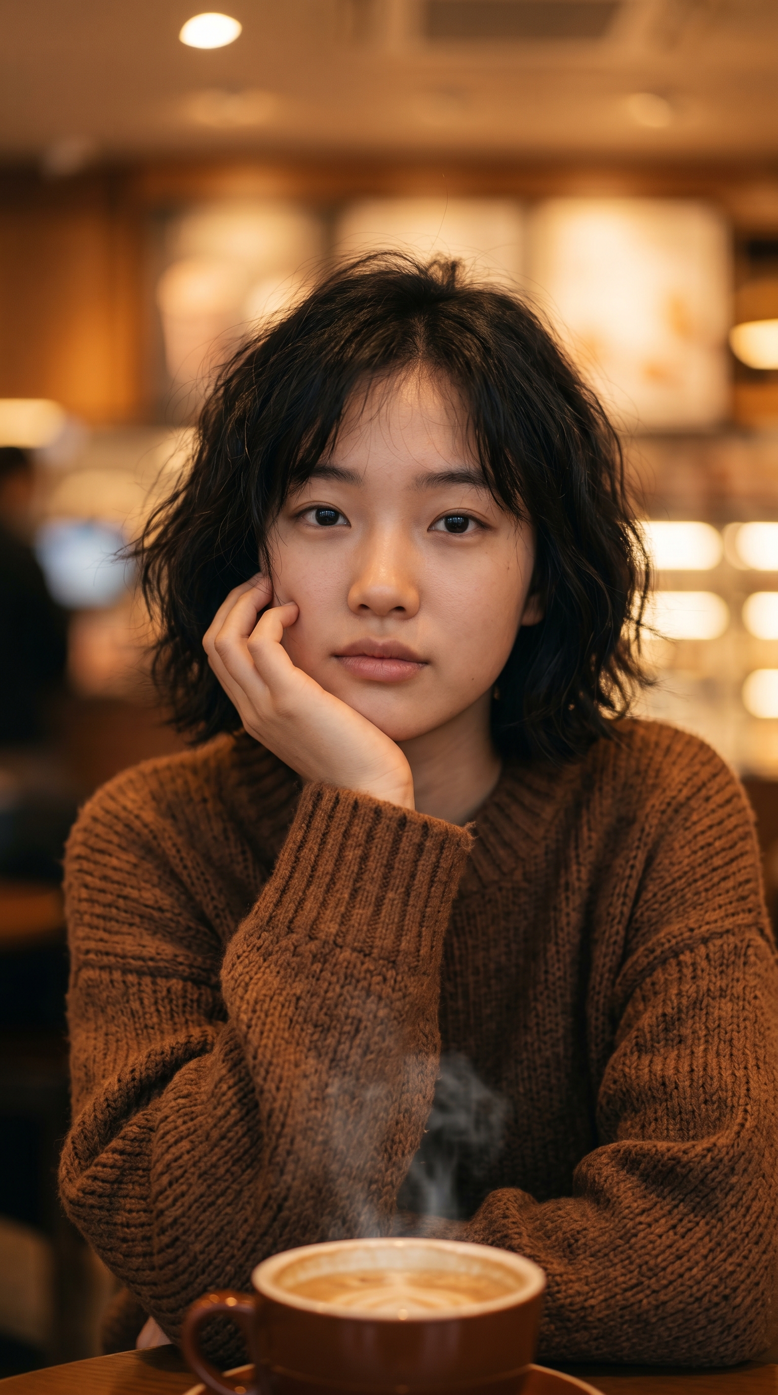 "主体": "短发微卷且略显凌乱的年轻东亚女孩,具有典型的东亚面部特征,身穿一件棕色超大号粗针织毛衣,皮肤纹理自然细腻。",