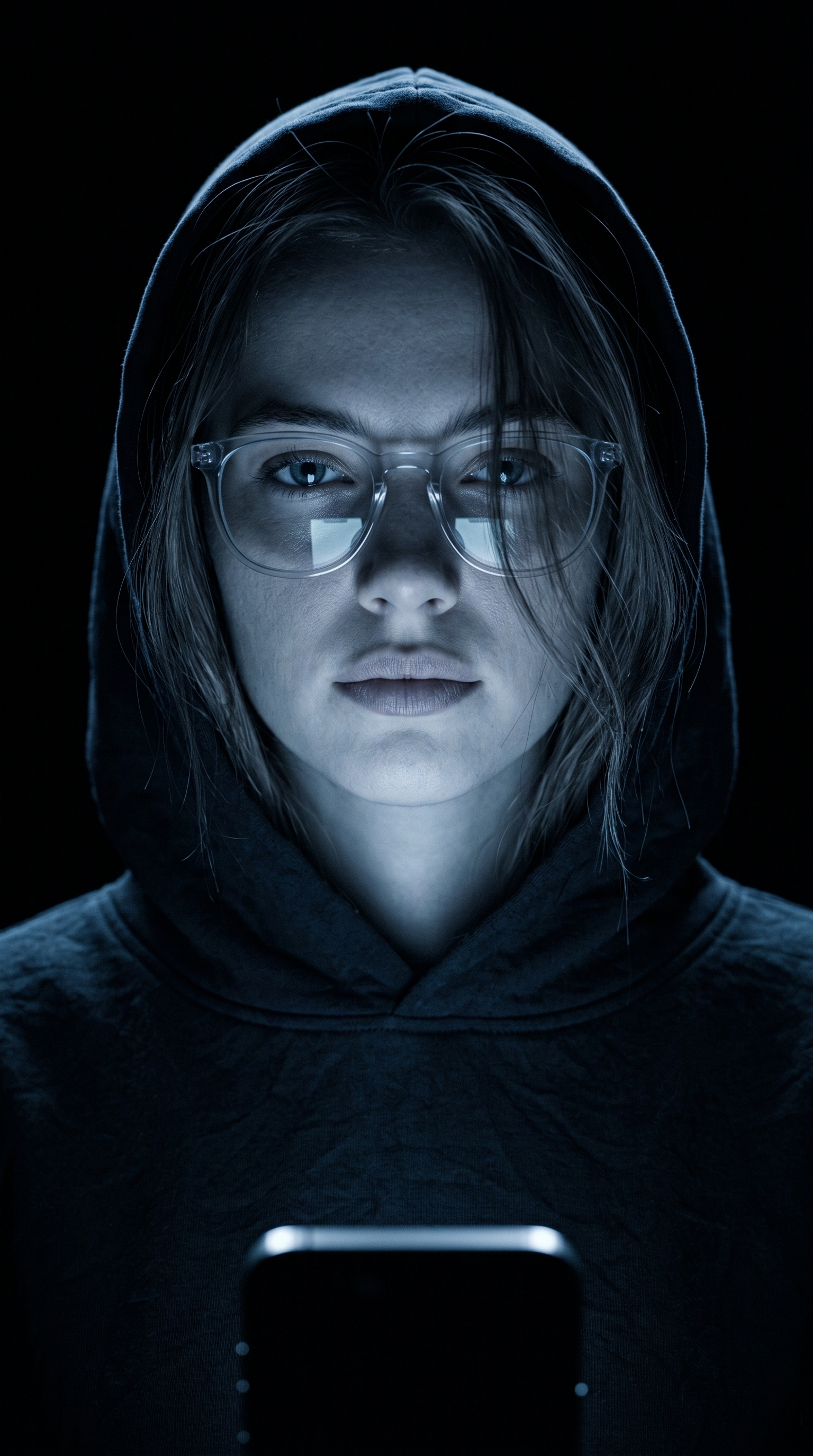 "内容描述": "一张极具电影感的超写实近景肖像。画面中心是一位戴着透明框架眼镜的年轻女性,她身穿深色廓形连帽衫,帽子轻搭在头顶。手机屏幕的冷色光线由下而上垂直投射在面部,勾勒出深邃且略带神秘感的轮廓。凌乱的发丝遮住一只眼睛,营造出强烈的视觉张力和故事感。",
