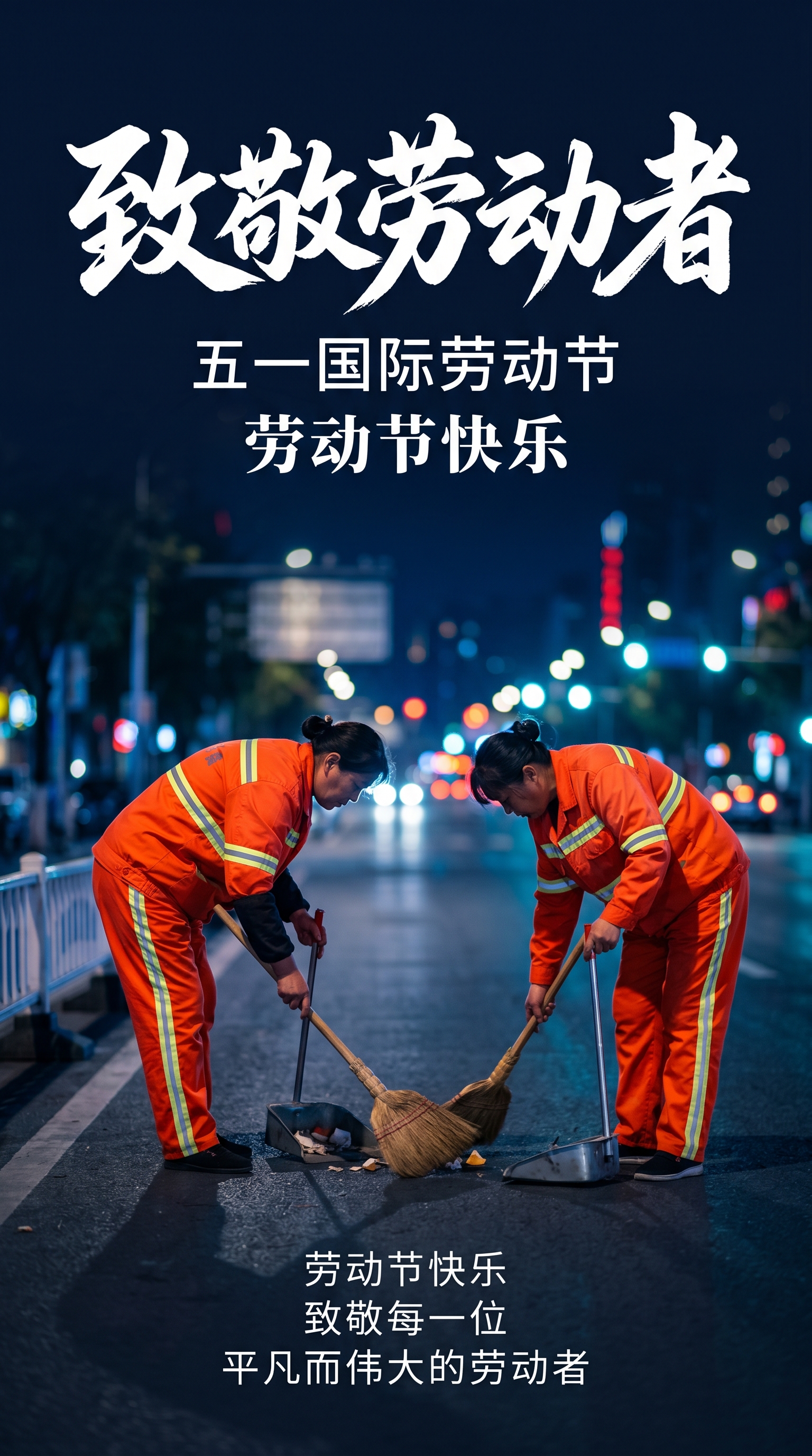 提示词简介: 本提示词构建了一个具有电影质感的人文场景。画面主体是一位身穿荧光橙色环卫服的工人,在深夜或黎明的路灯下低头清扫,背景是繁华城市灯火的虚化效果。顶部以霸气苍劲的白色书法字书写“向劳动者致敬”,金色的流线光束横穿画面。摄影的写实性与文字的艺术性相结合,传达出一种深沉而神圣的敬意。