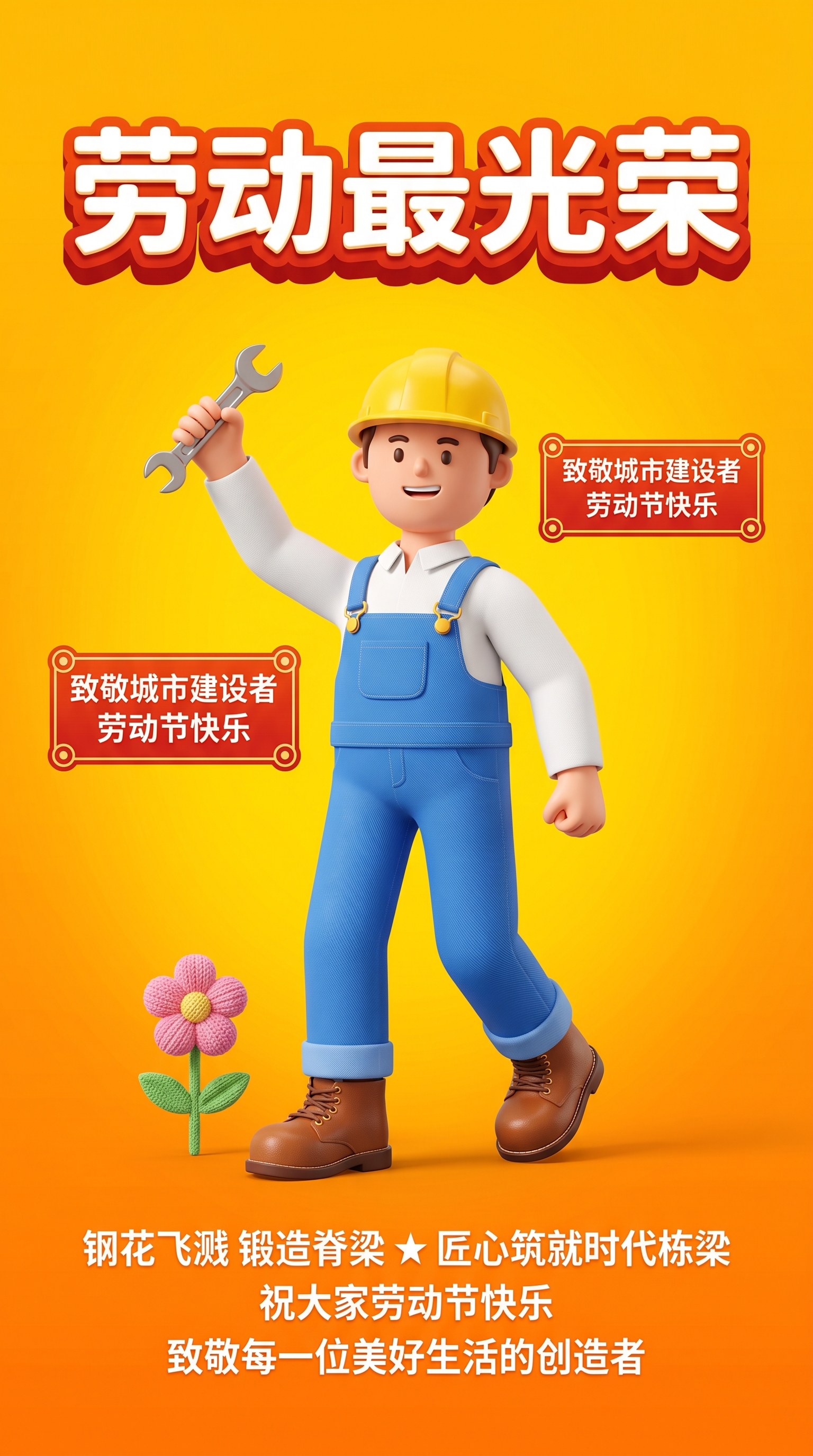 提示词简介: 这是一张色彩明度极高、充满阳光气息的工匠主题海报。画面主角是一个身穿蓝色工装裤、头戴亮黄色安全帽的3D工匠角色。他步伐轻快,手中自信地举着一把金属质感的扳手,脸上洋溢着自豪的笑容。整个背景采用了温暖的橙黄渐变色,地面上开出了几朵小巧可爱的针织质感花朵。文案激昂向上,完美契合“劳动最光荣”的节日内涵。