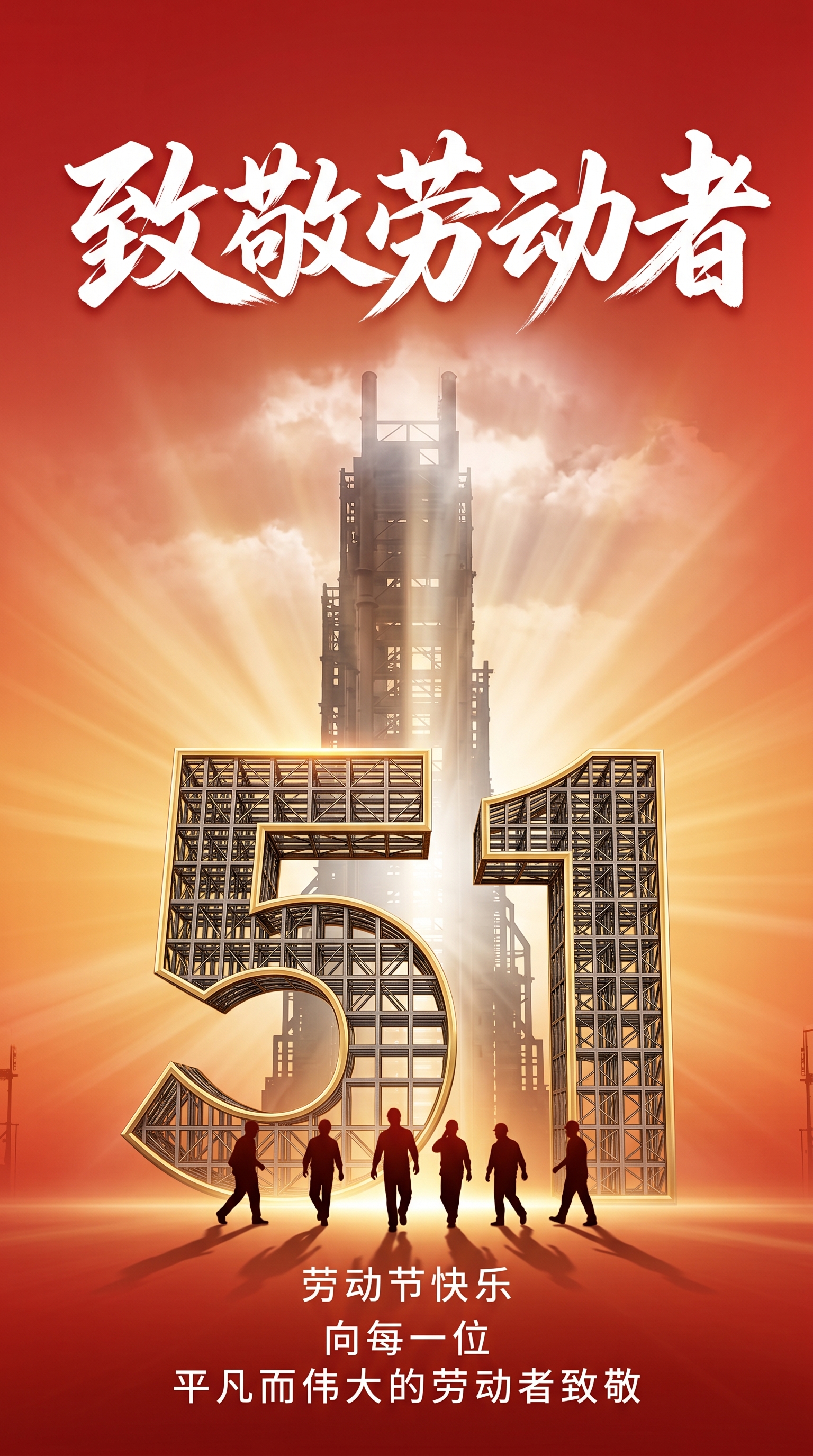 提示词简介: 本海报是一张极具工业力量感与视觉震撼力的艺术作品。画面背景中,正在建设中的钢筋骨架交织成两个巨大的数字“51”。金色的阳光从钢架的缝隙中倾泻而出,形成壮丽的丁达尔效应(光束感)。在庞大的钢架构架下方,几名工人的微小剪影正坚实地行走。顶部采用了苍劲有力的白底毛笔书法,书写着“向劳动者致敬”,整张画面充满了史诗般的厚重感。