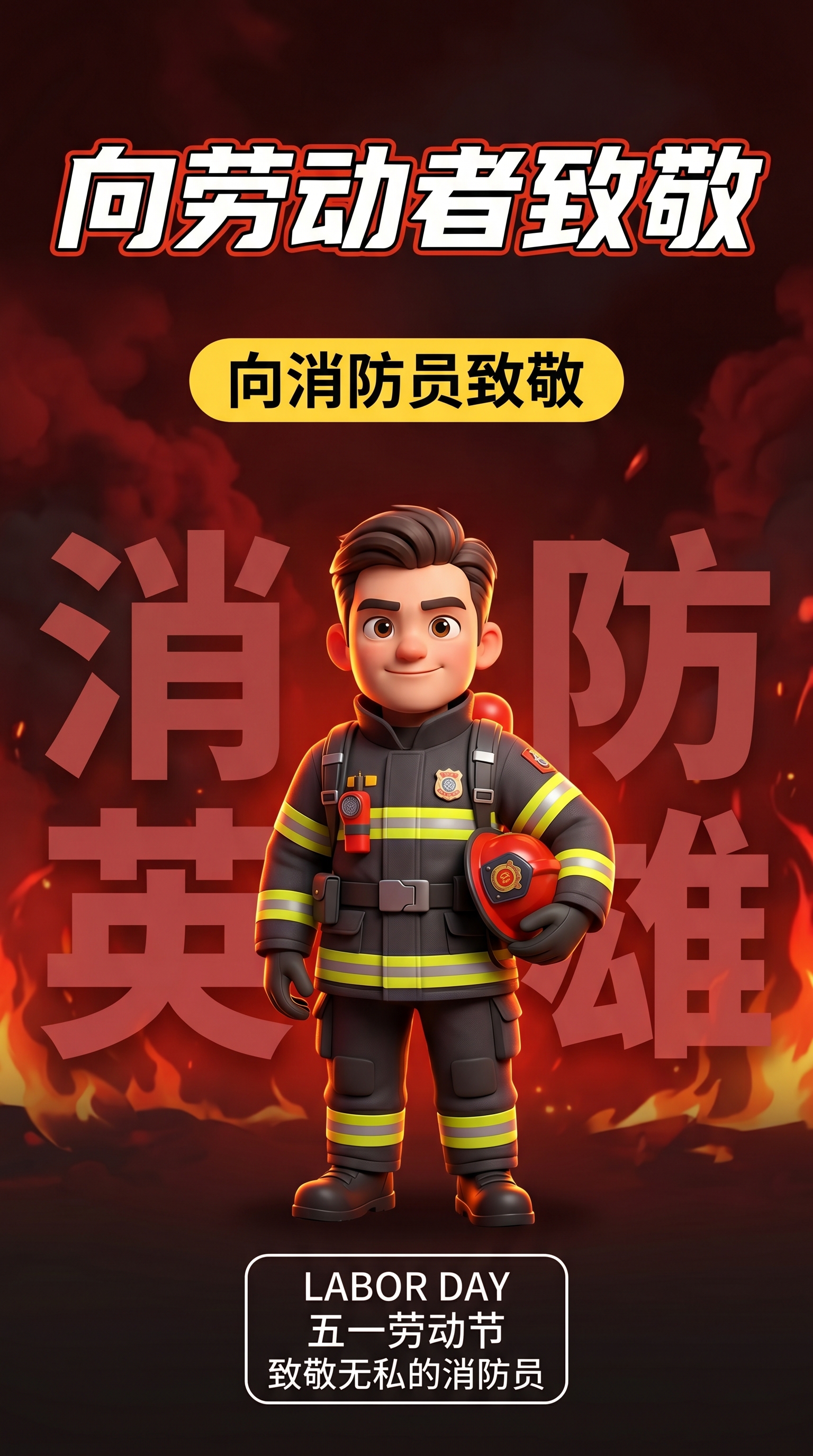 提示词简介: 这张海报聚焦于特定行业的劳动者——消防员。采用时下流行的3D Q版建模风格,既保留了职业的庄重感,又增加了亲和力。火焰背景与英雄微笑的强烈对比,传递出温暖而坚定的力量。