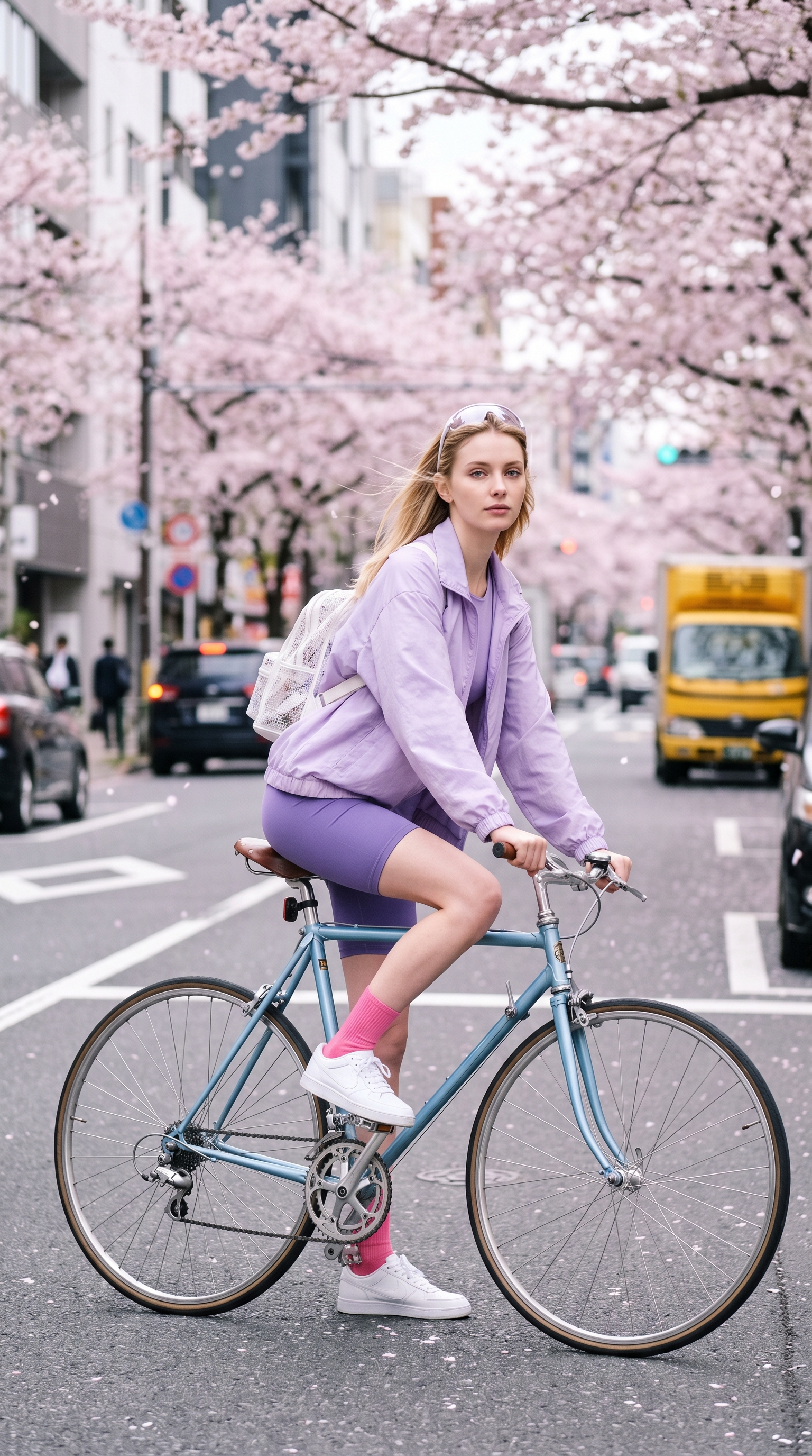 本提示词旨在创作一张融合都市运动与春季浪漫的高级感时尚人像。通过精准的色彩控制(淡紫与樱粉)和复杂的动作捕捉,模拟顶级时尚杂志(如《VOGUE》或《Popeye》)的摄影质感。它不仅捕捉了单车骑行的动态瞬间,更通过模特的眼神交流建立了极强的情感张力。