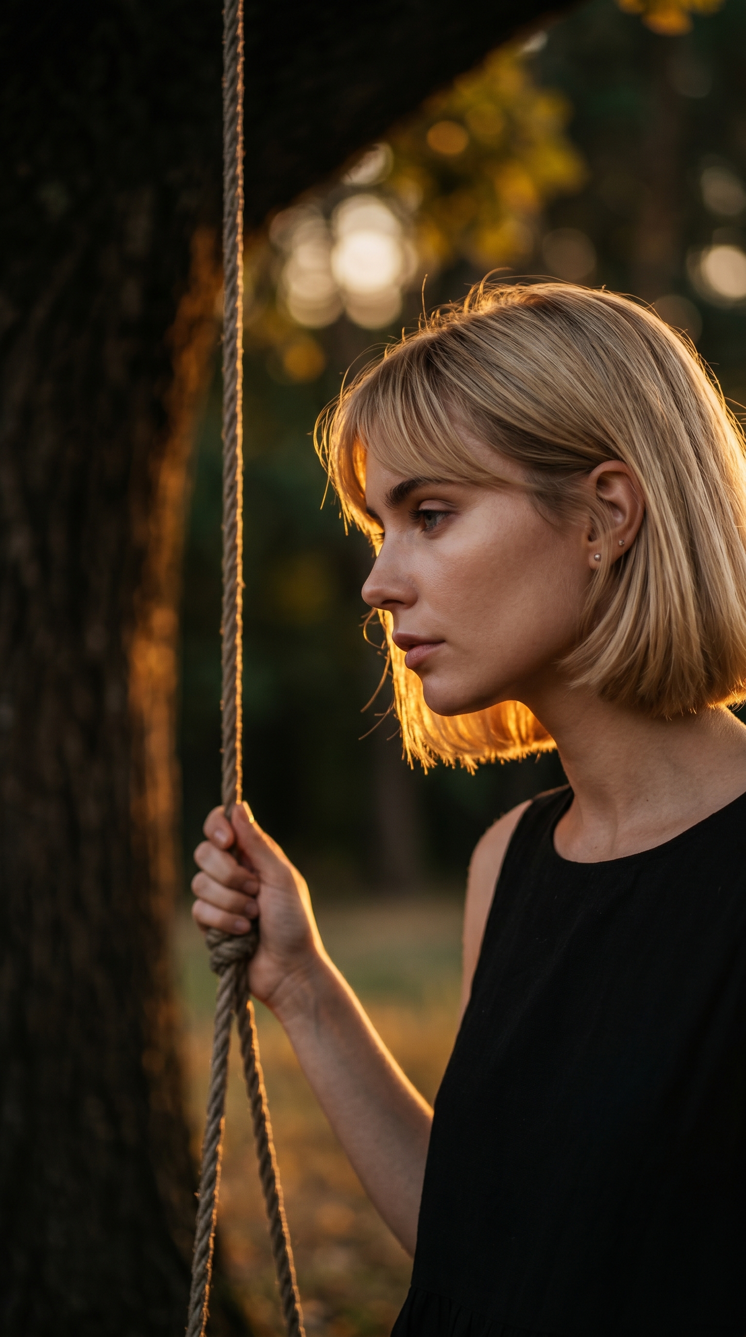 "内容描述": "一位留着金色短发波波头和齐刘海的年轻女性,静静地坐在巨大树荫下的秋千上。此时正值日落黄昏,温暖的金色光辉洒在她的身侧,营造出一种忧郁而高级的社论时尚感。",