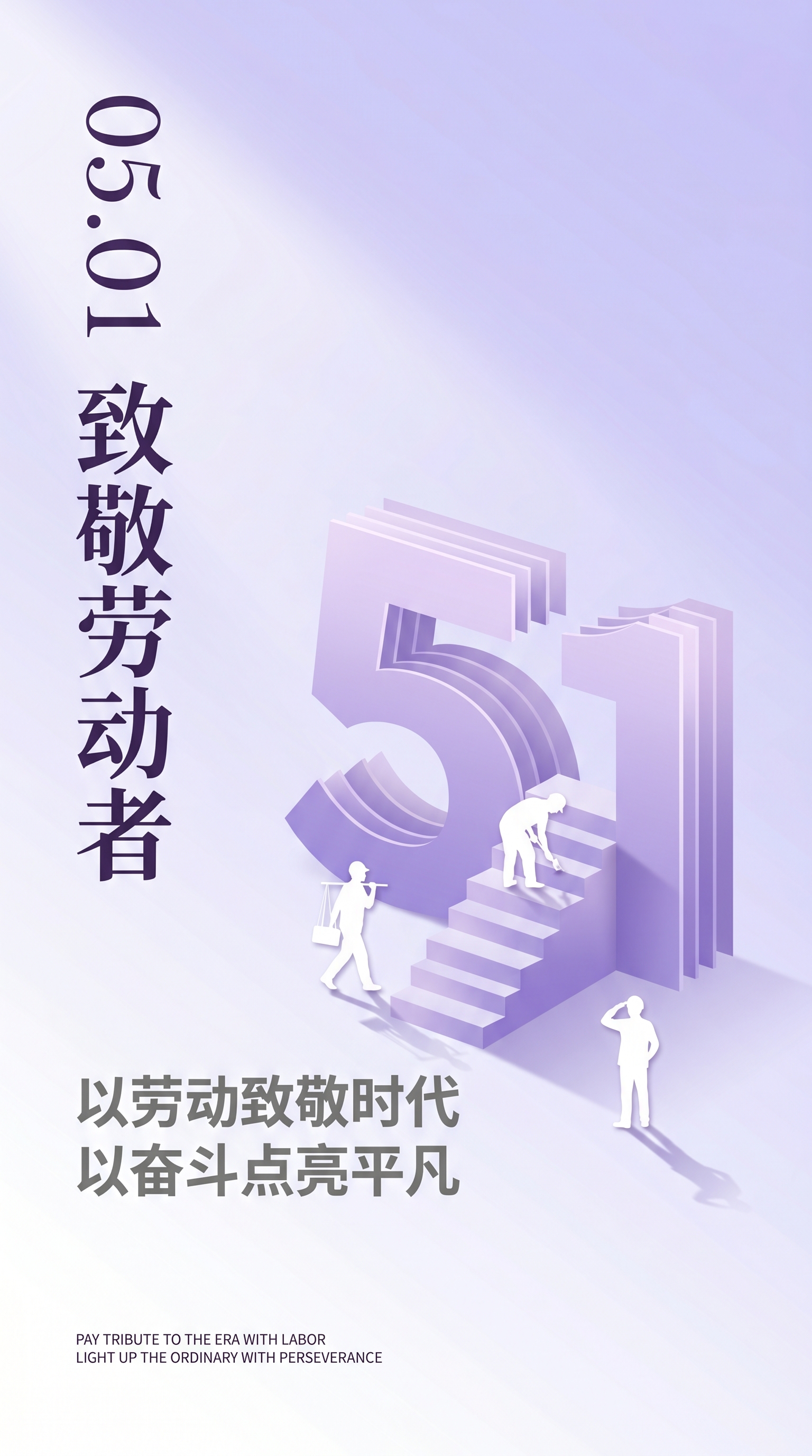 提示词简介: 该设计采用极其纯净的淡紫色调,将数字“51”抽象化为不断上升的层叠阶梯。微缩的小人剪影置于阶梯之上,象征着各行各业劳动者在平凡岗位的默默坚守,整体氛围通透、圣洁且具有向上的力量感。