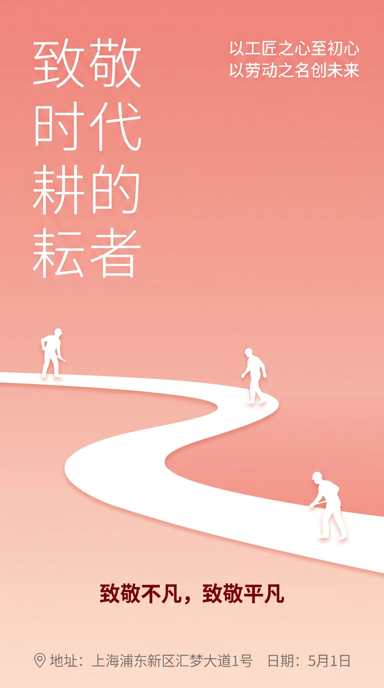 提示词简介: 采用极其简约的艺术手法,将数字“五一”演化为无限延伸的路径。粉橙色的渐变背景配合纯白的微缩人物剪影,构筑出一种空灵、高端且富有哲思的意境。