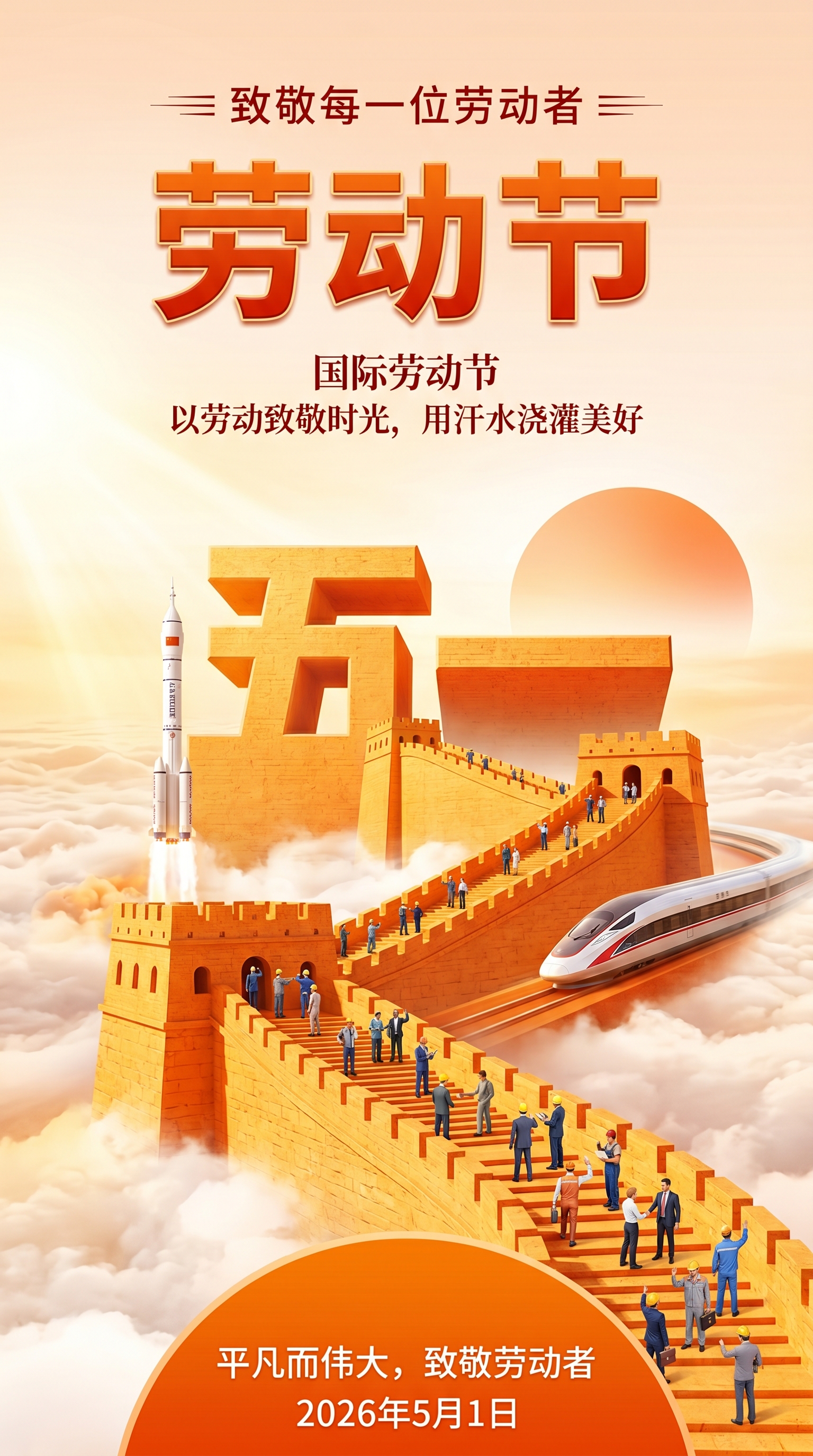 提示词简介: 这是一款极具家国情怀的致敬海报。将数字“五一”巧妙幻化为巍峨的长城台阶,并点缀了各行各业的劳动者、火箭以及高铁。画面构图宏伟,体现了“劳动创造大国重器”的自豪感。