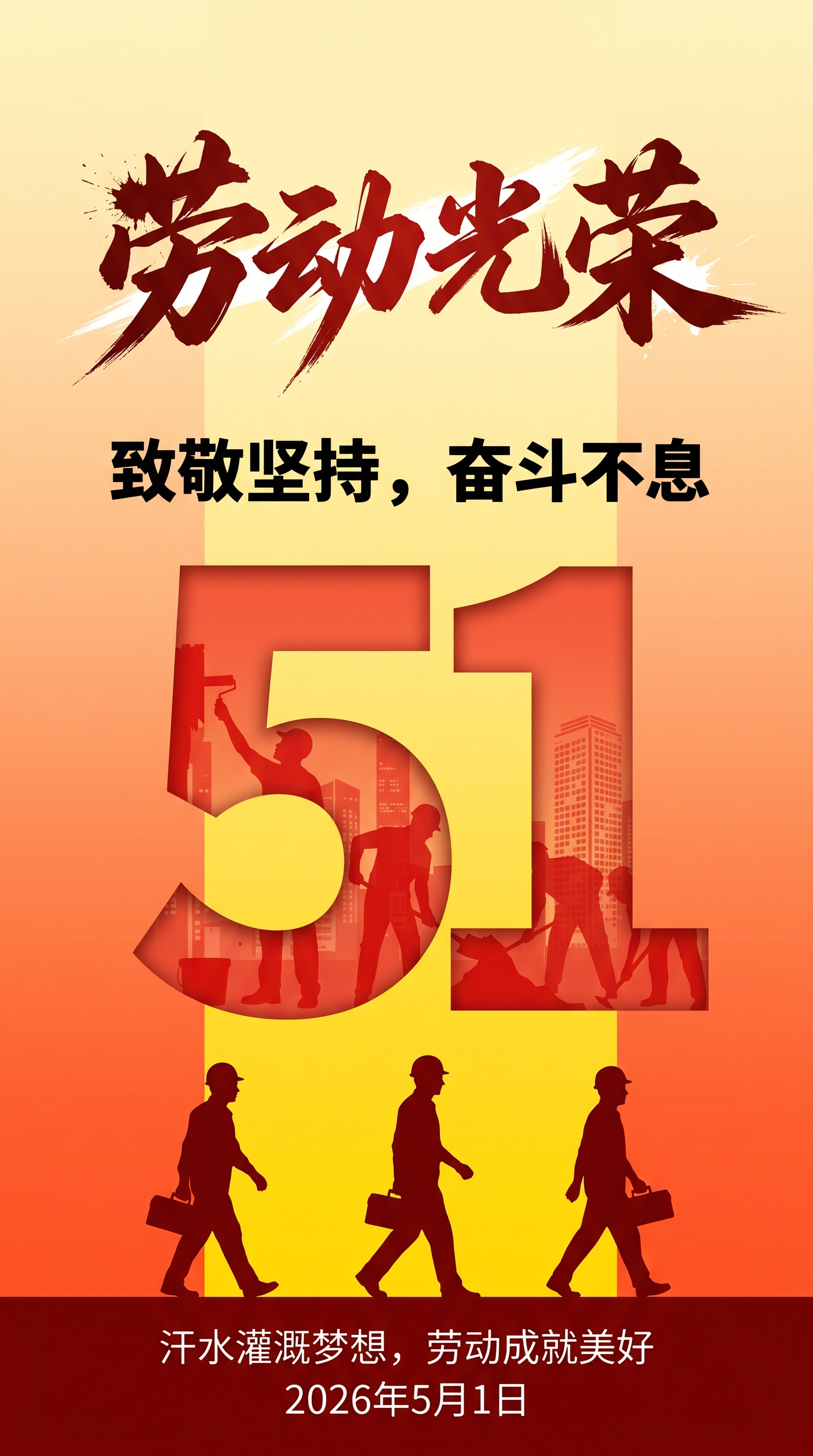 提示词简介: 本设计采用极具冲击力的橙红渐变色调,以建筑工人劳作的大型剪影作为视觉主体。画面将工人身影与高耸入云的摩天大楼重叠嵌套,完美诠释了“劳动创造城市”的宏大叙事,极具时代奋斗感。