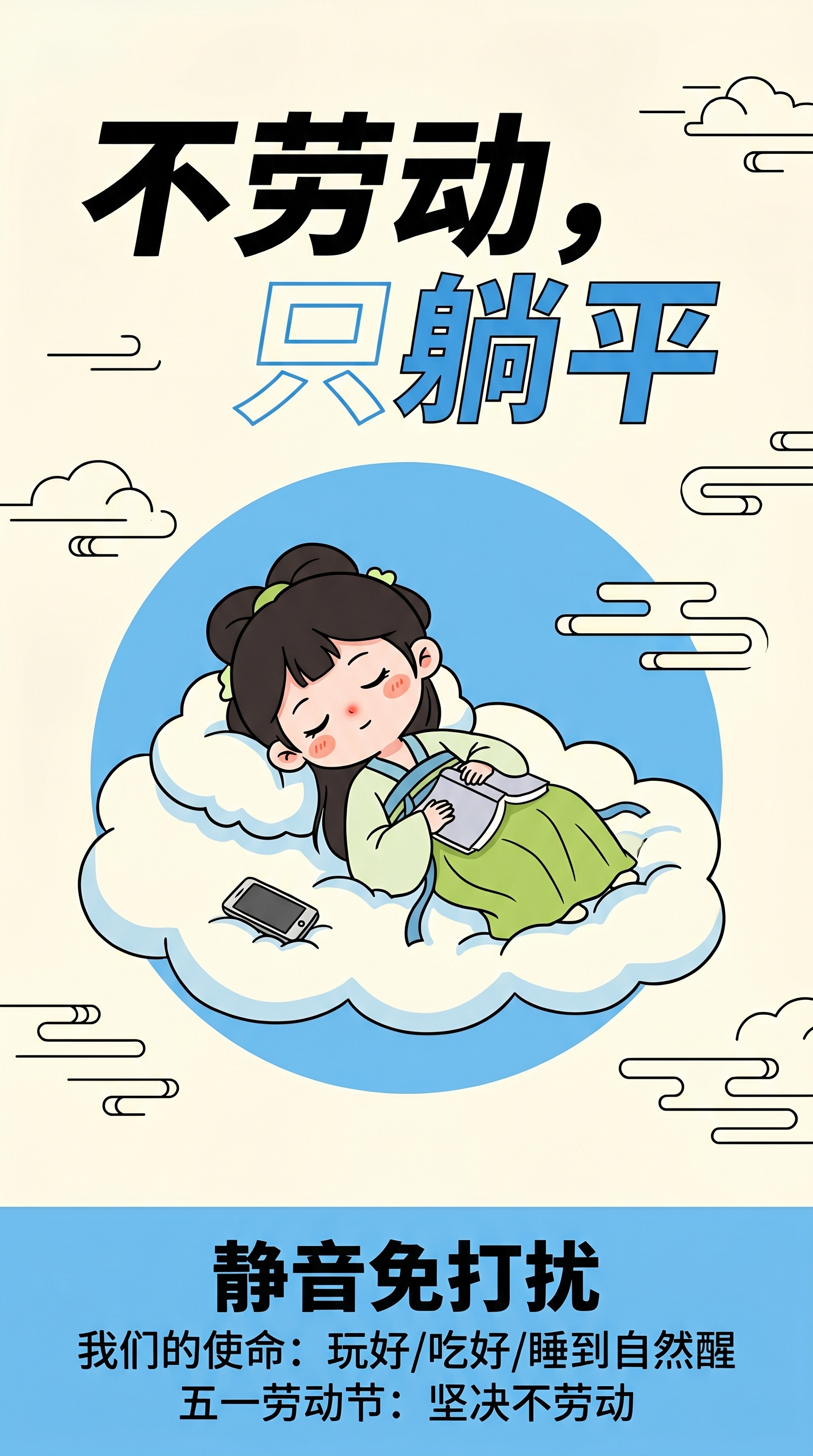 提示词简介: 这张海报采取了截然不同的“反向营销”策略。它精准捕捉了现代劳动者在节假日渴求彻底休息的心理,以Q版古风人物悠闲“躺平”为主题,色彩清凉通透,文案幽默贴心,是一款极具社交属性的节日海报。