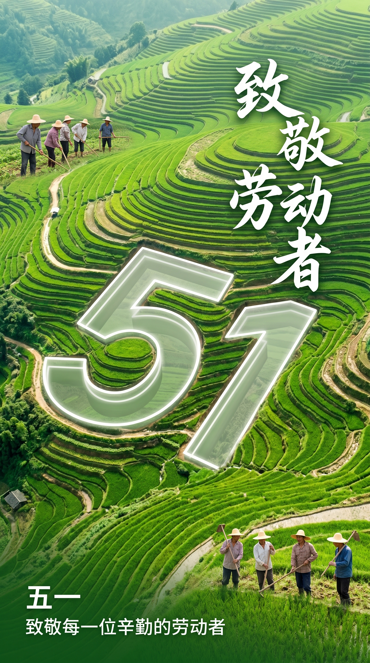 提示词简介: 这是一张极具视觉震慑力的写实风格海报。它选取了宏大的绿色梯田作为背景,通过俯瞰视角展示了大地如指纹般的脉络。半透明的数字“51”巧妙地隐于田埂之间,致敬了与土地共生的耕耘者。