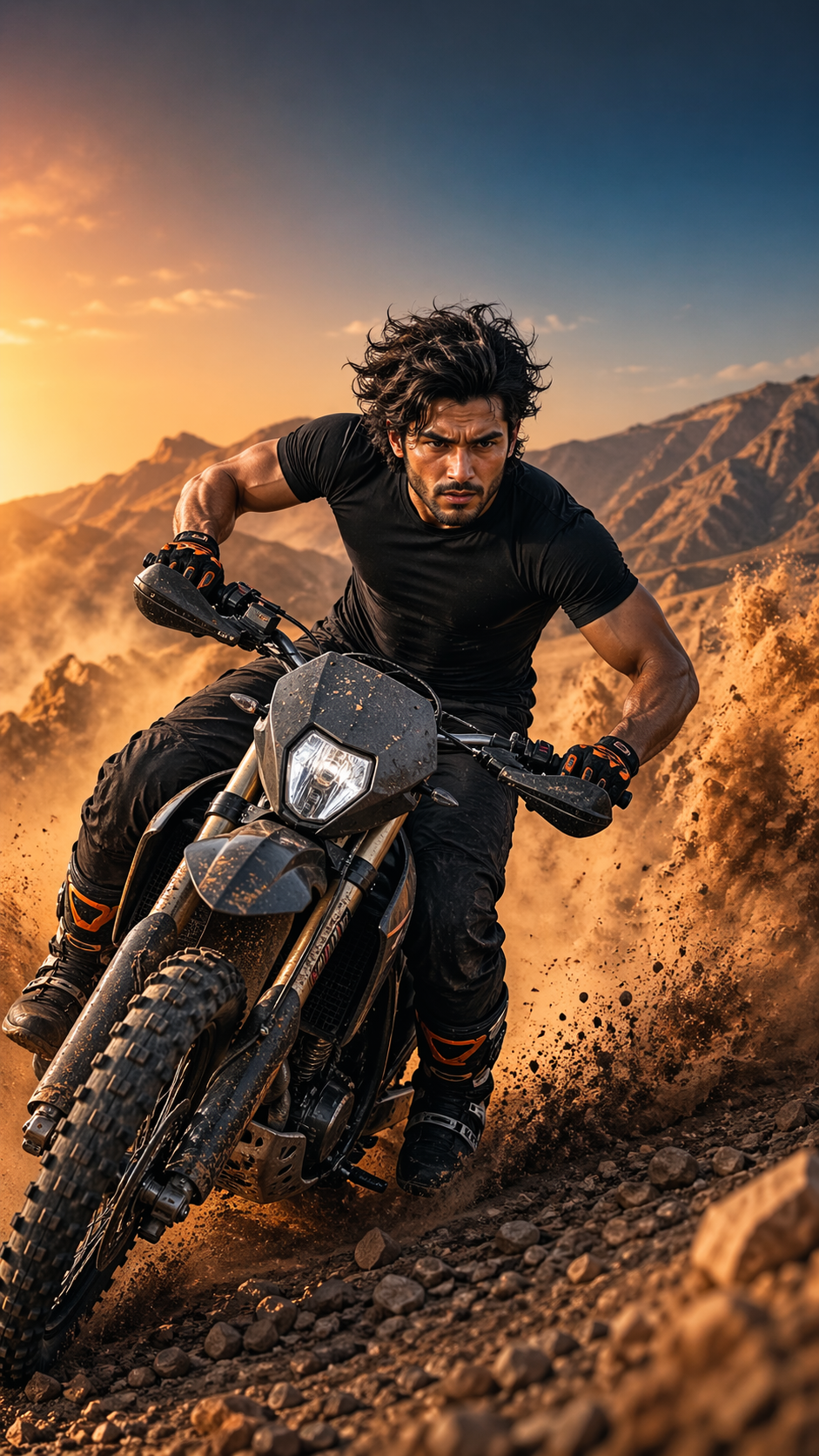 "内容描述": "一张电影感十足的高分辨率动作肖像,捕捉了一位年轻男子在黄金时刻骑着现代越野摩托车穿越崎岖碎石地形的瞬间。他正积极向前倾斜身体,在转弯时表现出专注和激烈的表情。他有一头凌乱随风飘动的深色头发,淡淡的胡须,犀利的下颌线,健壮的身材,穿着一件合身的黑色压缩T恤,深色工装裤,带有橙色细节的黑色摩托车手套,以及带有橙色点缀的黑色赛车靴。",