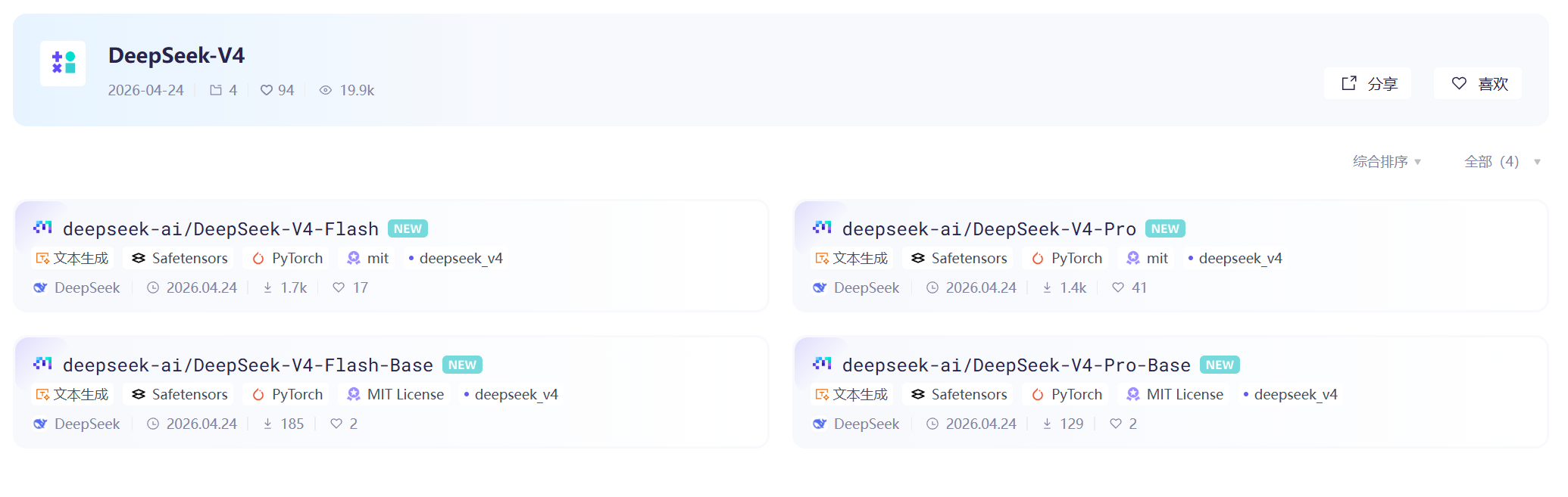 DeepSeek-V4 系列模型已全量开源至 Hugging Face 与魔搭社区,配套技术报告同步披露于 Hugging Face 官方仓库中,开发者可自由下载、部署与二次开发: