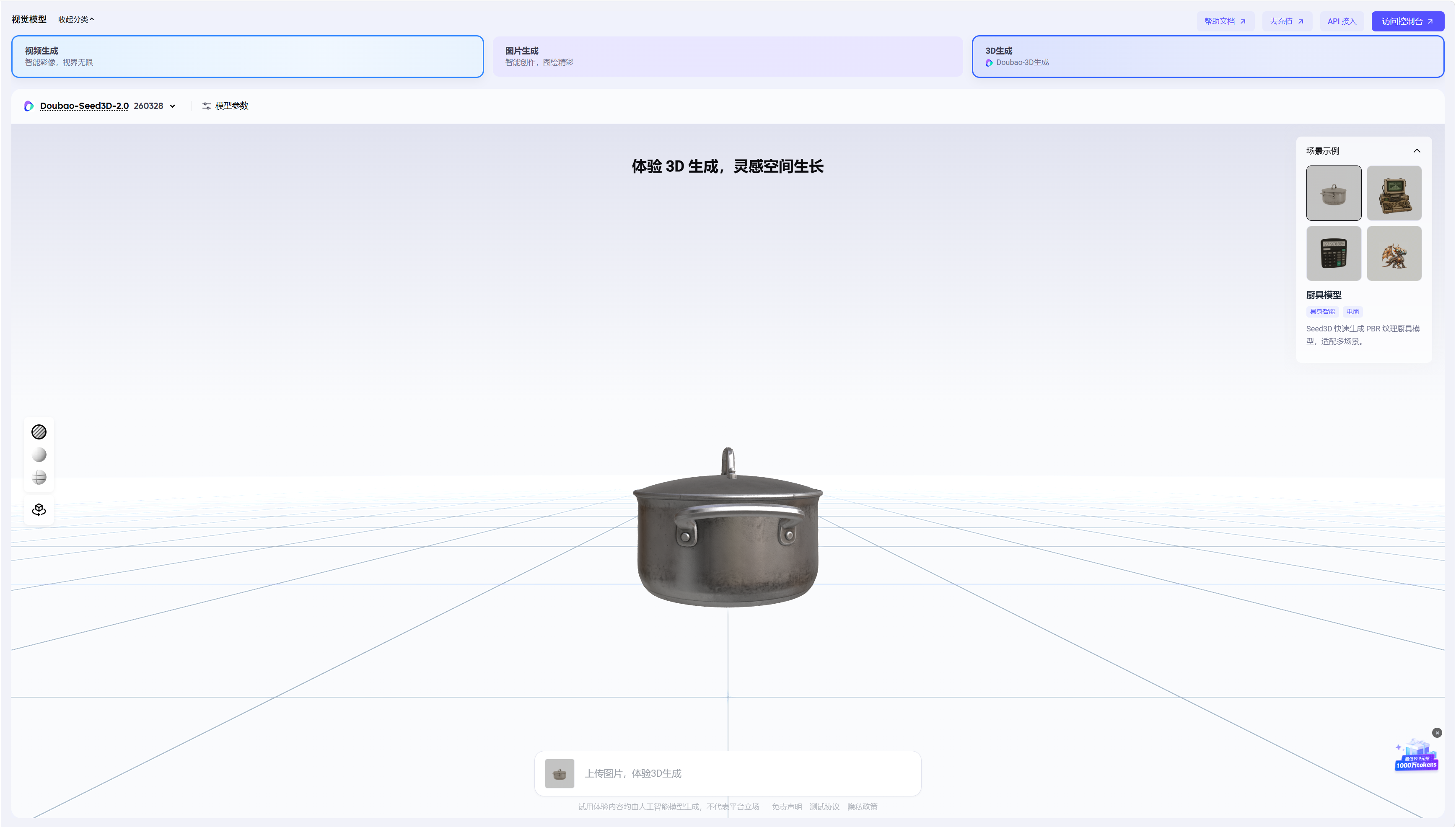 - 体验入口:火山方舟体验中心 – 登录 – 选择视觉模型 – 3D 生成 – Doubao-Seed3D-2.0