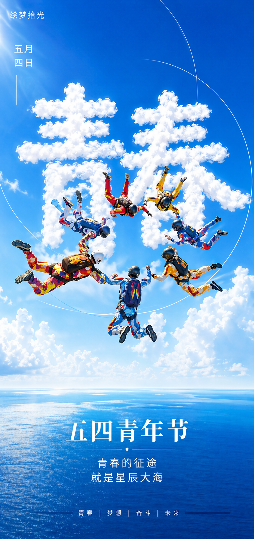 该提示词围绕“五四青年节”主题,构建一个明亮通透的蓝天海洋场景,通过云朵塑形文字与跳伞青年人物结合,表达青春、自由与探索精神。整体采用纵向居中排版,强调视觉层级清晰与空间纵深,强化轻盈感与希望氛围。画面全部文字统一为中文表达,避免英文出现,增强本土文化语境与节日属性,同时保证画面简洁高级,适用于节日宣传海报设计。