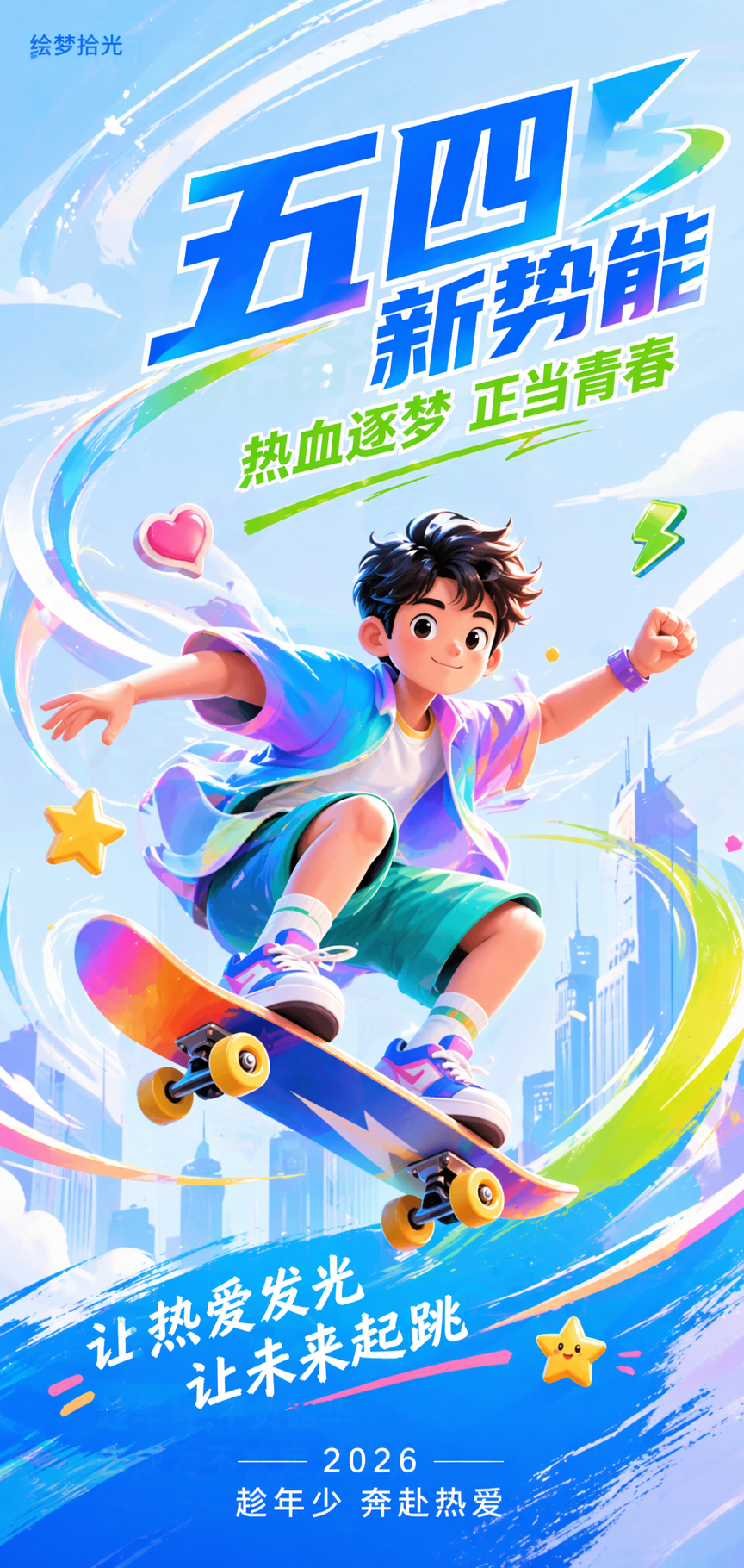该提示词围绕“五四青年+滑板运动”进行创新设计,在保留青春活力主题的同时,通过“新势能”概念强化时代感。整体采用浅色渐变与动感构图,突出人物腾空瞬间,搭配流线光效与趣味图标,营造轻快、未来、积极的视觉氛围。所有文字均为中文设计,强调视觉统一性与文化表达,适合现代青年节宣传海报生成。
