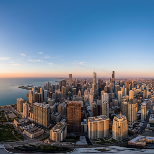 中文:日落时的沙漠全景,有约书亚树、大型岩石,天空呈温暖橙紫色,沙漠植被稀疏。