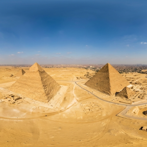 本作品以完整球形等距柱状投影呈现位于吉萨金字塔群的宏伟景观,...