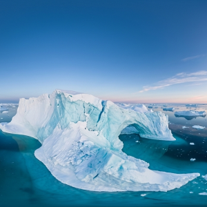 本作品以完整球形等距柱状投影呈现位于迪斯科湾的极地冰山景观,...