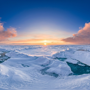 本作品以完整球形等距柱状投影呈现位于北极圈内的冰封海面景观。...