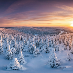本作品以完整球形等距柱状投影呈现位于拉普兰的极地雾凇雪林景观...