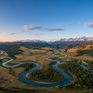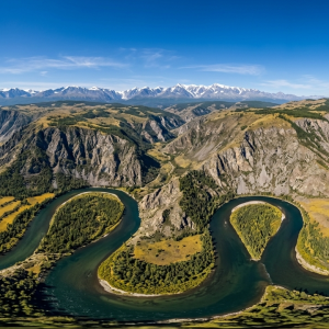 简介 本提示词还原俄罗斯阿尔泰山区的蛇形曲流河峡谷奇观,以超...