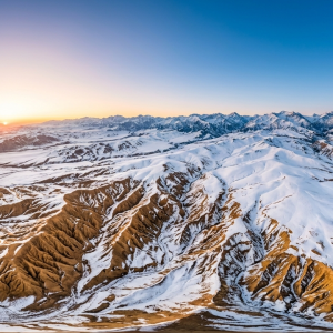 简介 本提示词还原中国天山山脉的戈壁雪原日出奇观,以超高空无...