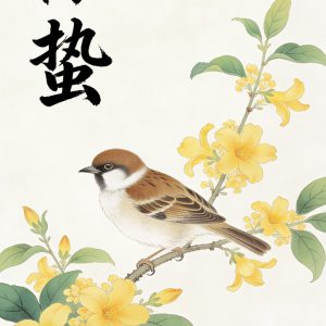 以工笔国画手法,描绘惊蛰时节迎春花开、山雀栖枝的春日景致,诠...
