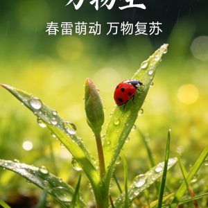 "以微距摄影视角,展现惊蛰雨后草叶新芽、虫醒春归的生机,用微...