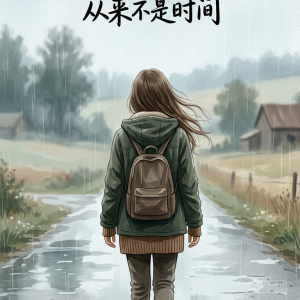 本作品采用9:16竖版中心式构图,以手绘质感写实风格呈现雨天...