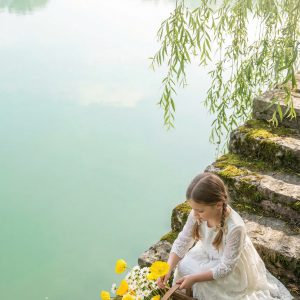 简介: 少女身着白色蕾丝长裙,置身于波光粼粼的浅绿湖畔,手提...