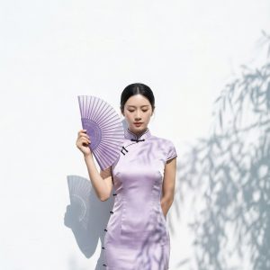 简介: 少女身着紫色新中式旗袍,在斑驳树影的白墙前持扇而立。...