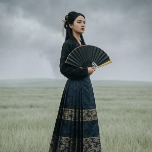 简介: 灰暗天空下的荒野中,一位女子穿着深蓝色马面裙侧立,风...