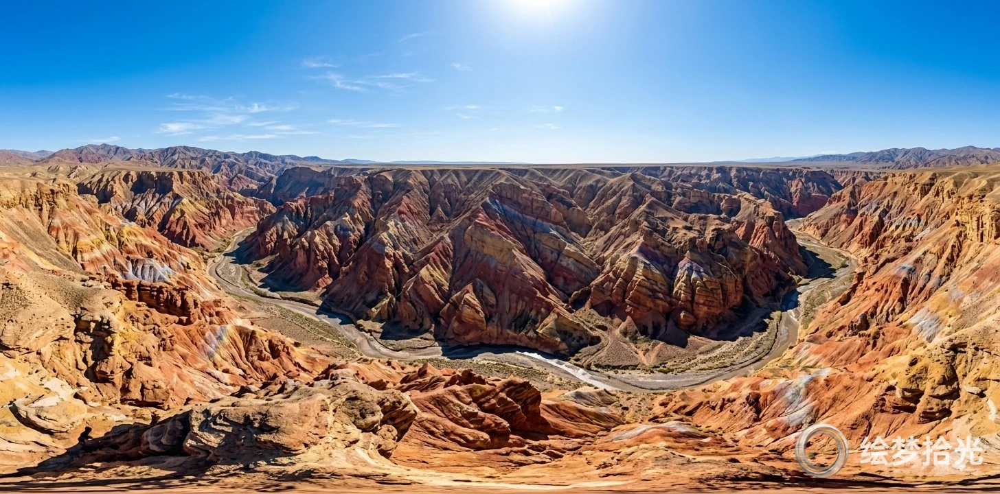**“彩色峡谷的立体肌理与岩层色彩的极致碰撞感”**。利用新疆阿尔泰五彩河谷标志性的彩色丹霞峡谷地貌,创造出置身大地画廊的奇幻与壮阔感,定格晴空正午日光下彩谷色彩绽放的震撼时刻。